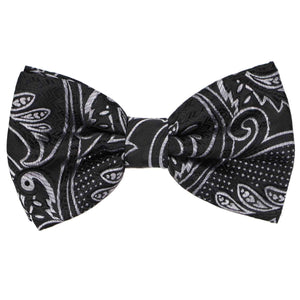 Take the guesswork out of what to wear when you add this black and silver bow tie to your accessory rotation. The silver paisley print is large and abstract. We really like this one for special occasions. Easy to match thanks to the black background.