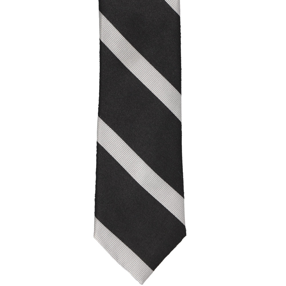 Root, root, root for your favorite team in this collegiate and modern, black and silver striped tie. The tie width is trimmed down to a size that’s trendy, but not too skinny. Getting back to the stripes, the wider ones feature a soft, smooth finish while the thinner ribbed ones add texture. Use it for a school uniform, wear it to graduation or to simply cheer on your favorite team.