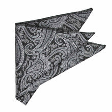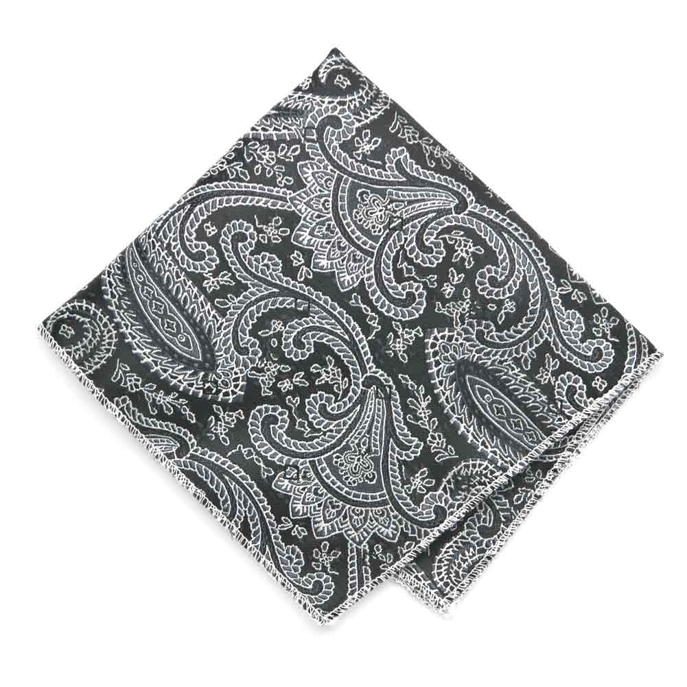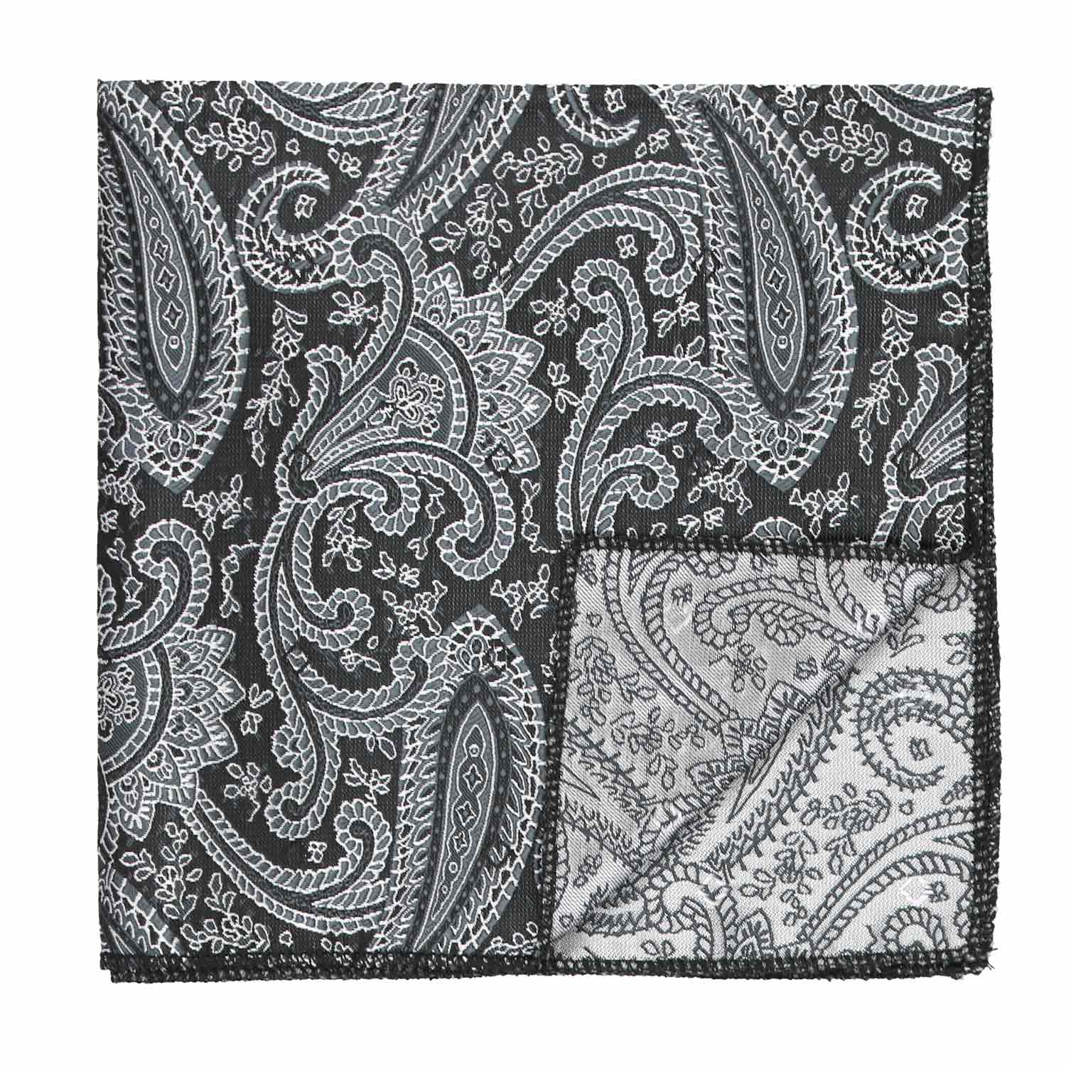 Black and silver paisley pocket square, flat front view