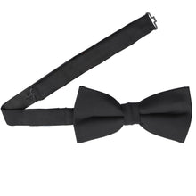 This pre-tied bow tie is secured in two steps: First, fitting it to the wearer's neck size and then fastening it around the neck. To wear it: