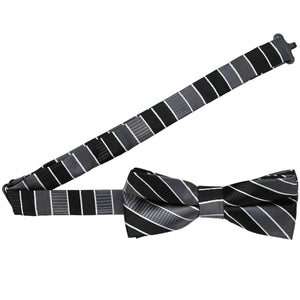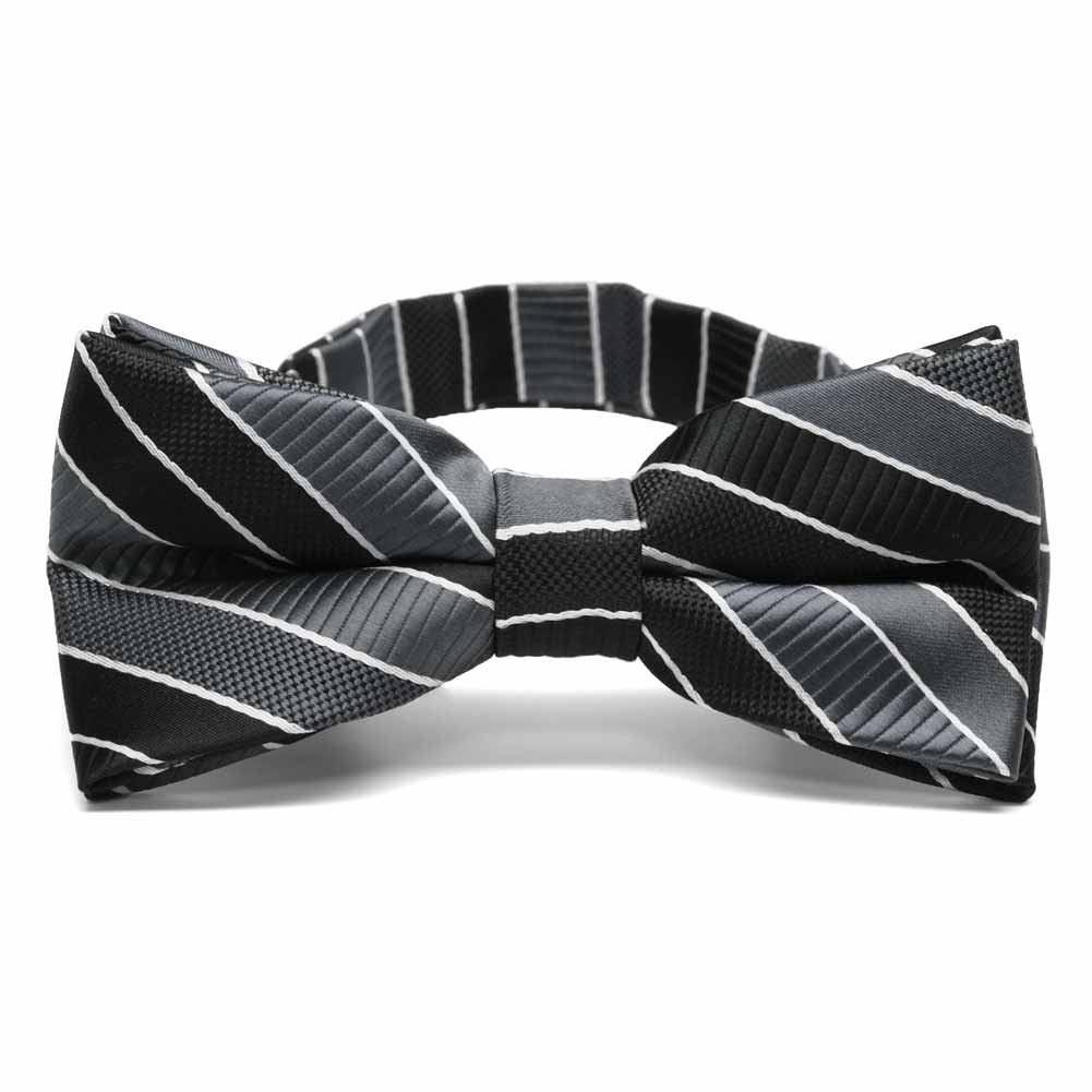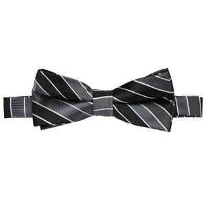 This black, dark gray, and white striped bow tie features a neutral color palette that is both versatile and sophisticated. Its timeless design makes it easy to match and coordinate with both formal and casual attire, making it ideal for office wear or somber occasions. Whether paired with a suit or dressed down with shirts and slacks, this bow tie adds a refined touch to any look. Its classic striped pattern brings a polished elegance, perfect for those seeking a stylish yet understated accessory for any occasion.