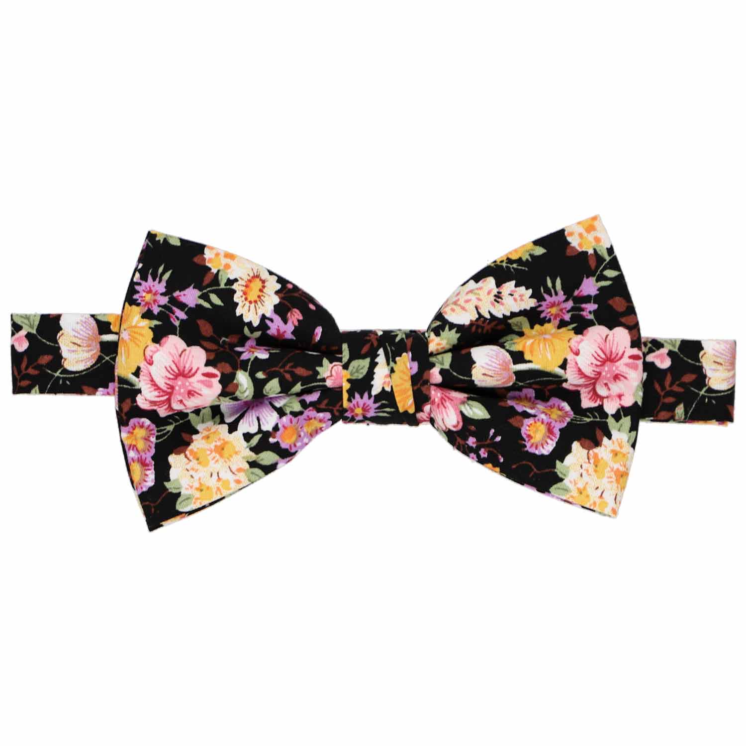 We made this floral bow tie from 100% cotton for a non-shiny look. It's a pre-tied style, so it easily attaches around the neck via an adjustable band collar.