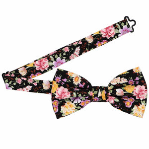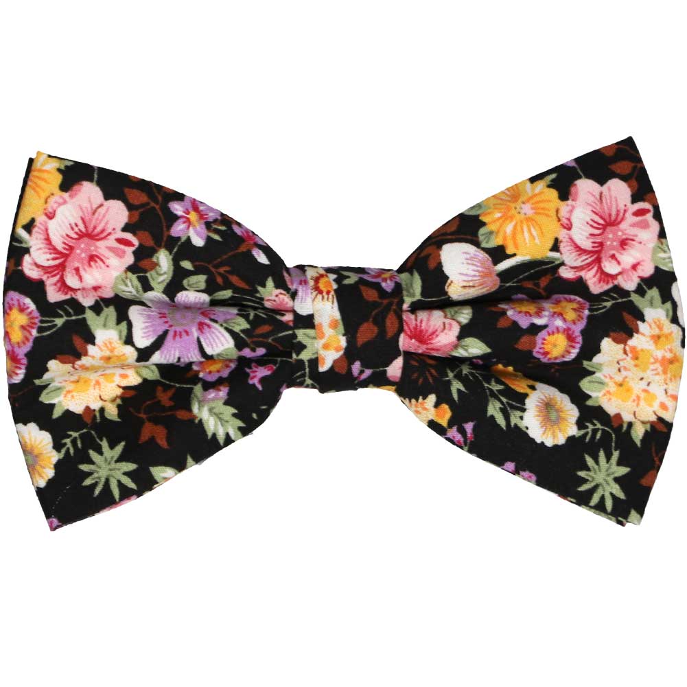Wear florals year-round with this black floral bow tie. It's true that florals are usually associated with spring and summer, but the dark tones on this bow tie make it perfect for cold-weather wear. This gorgeous bow tie is a top pick for weddings and it looks great with black, dark gray and even brown groomsmen suits. Matching pocket squares are available for purchase. If you're adding suspenders, we suggest black or tan.
