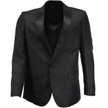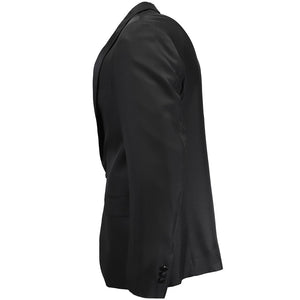 Now this is how you dress formally in the evening. Take a look at this men's dinner jacket. It's all black with a single button closure, two exterior flap pockets and one exterior breast pocket for a pocket square. But the collar is the showstopper here. It features a sleek, black satin peak lapel.