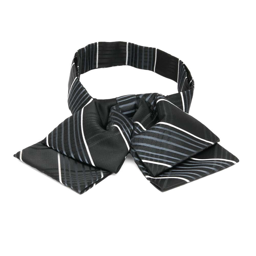 Exclusively ours! A pre-tied, floppy bow tie in a classic black, dark gray and white plaid design. The band collar adjusts to fit most men and women. Suitable for matching women's uniform wear or men's vintage-inspired attire.