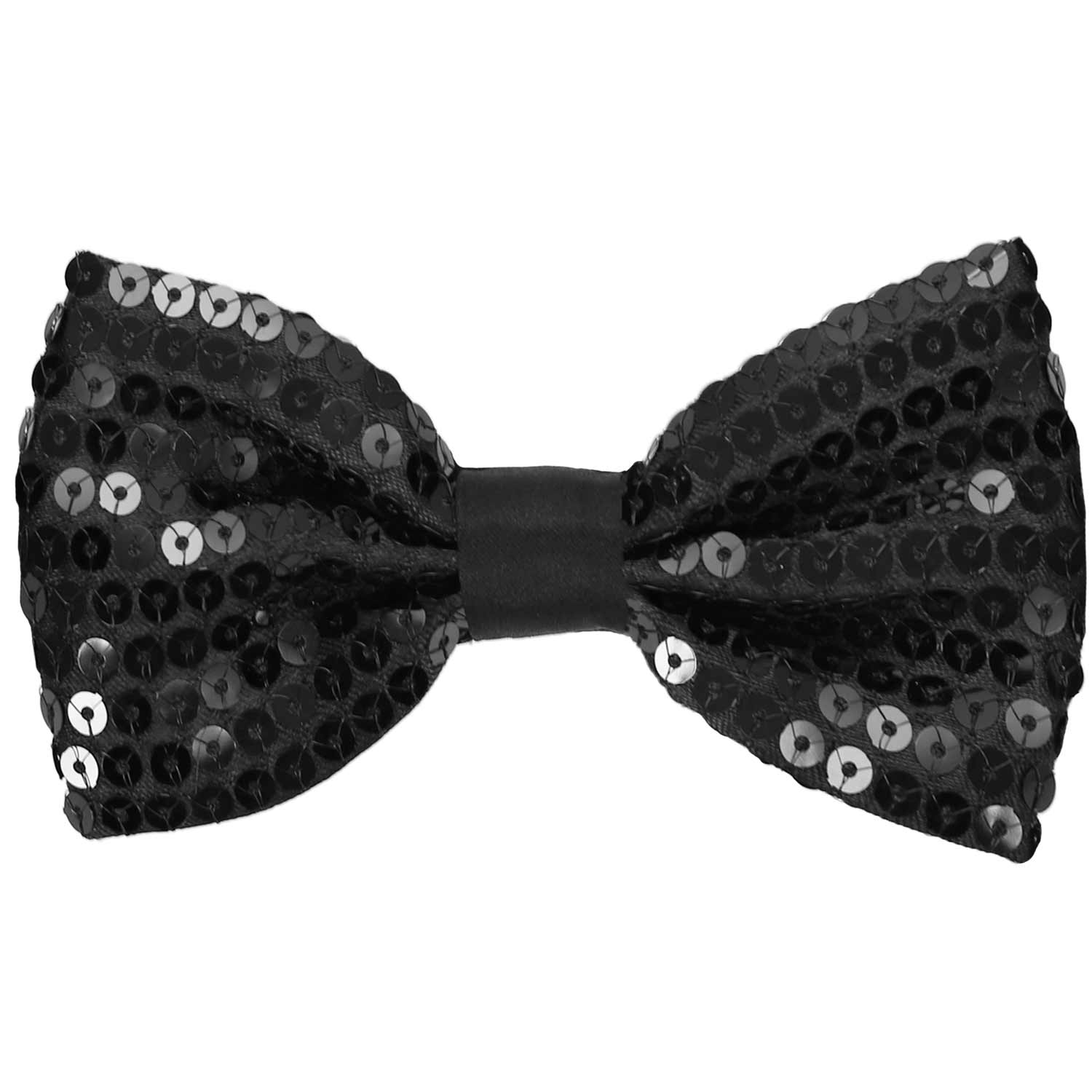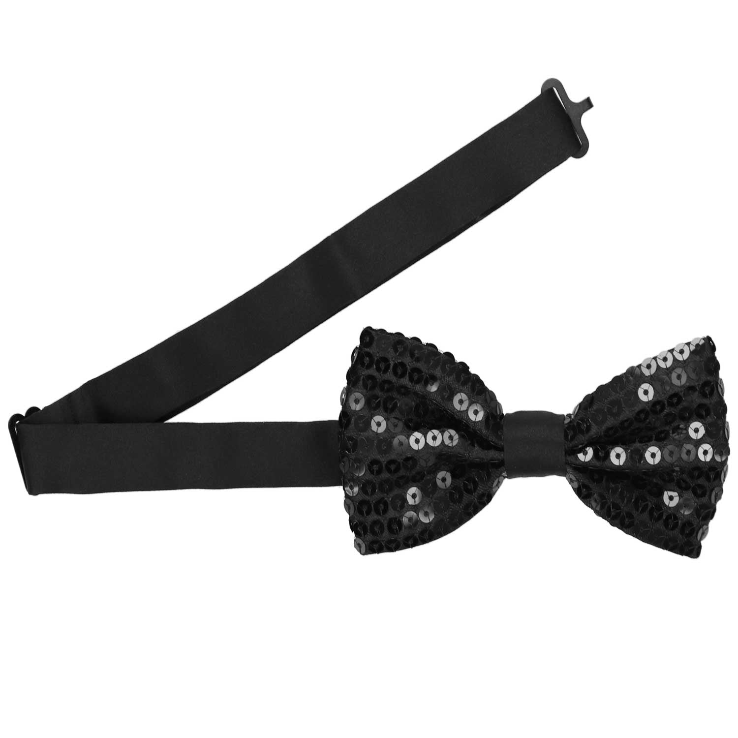 Tying a sequin bow tie would not be an easy task, so we made this one pre-tied. (The black sequin covered bow is kept in place with a matching satin center band.) The bow tie features an easy-to-use adjustable band collar that fits most teens and adults.