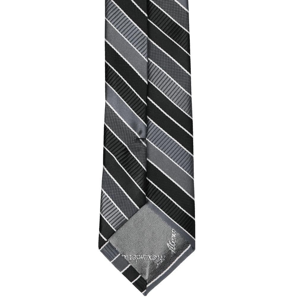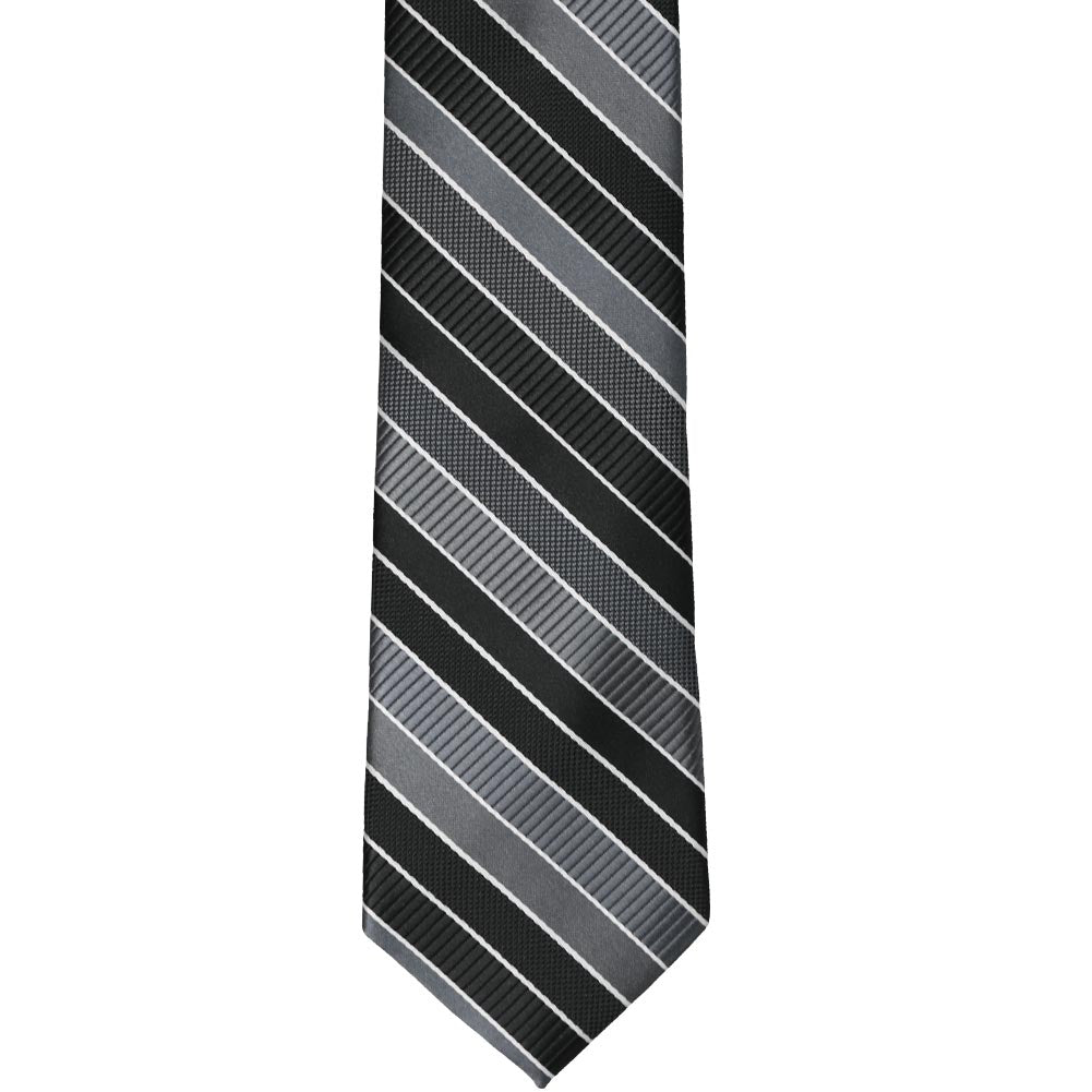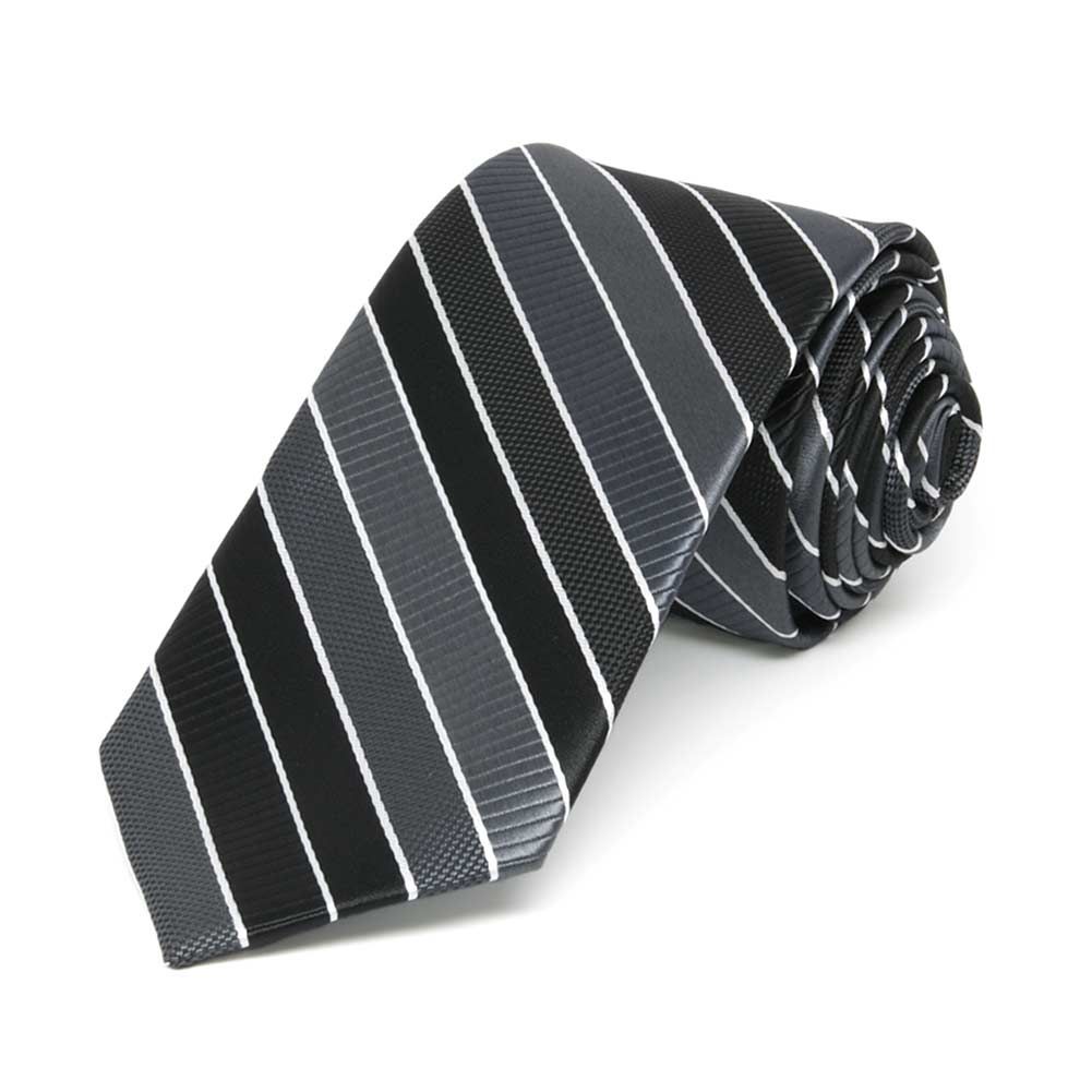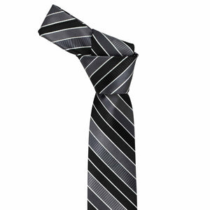 This slim tie is a refined choice for both formal events and somber occasions. Featuring black and gray stripes in multiple finishes—ribbed, textured, and solid satin—subtly accented with thin white pencil stripes, it offers understated elegance. The dark color scheme pairs perfectly with black or dark gray suits, making it a versatile addition to your wardrobe for those moments that call for a polished and respectful look.