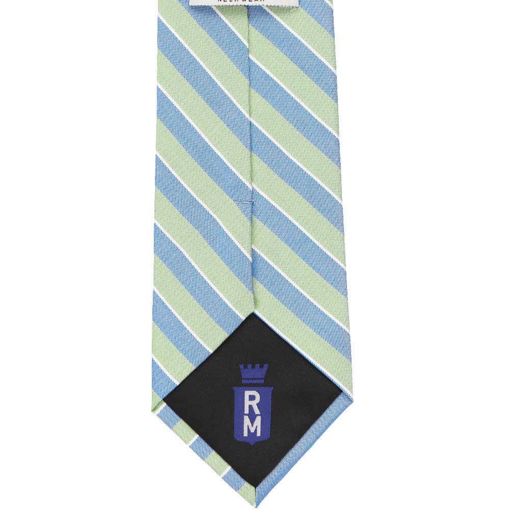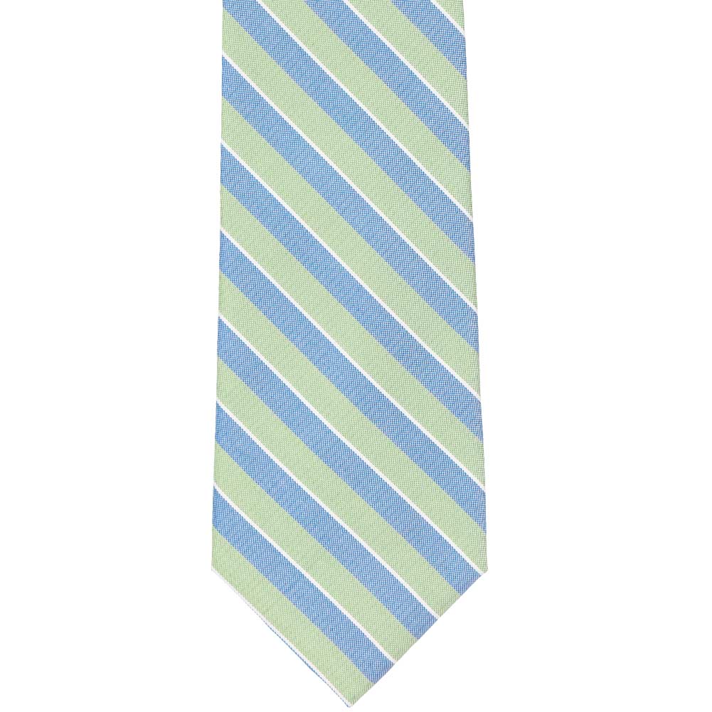 Gentlemen, this striped tie is a must-have in your warm-weather wardrobe. The airy light green and blue striped pattern is sophisticated, casual and cool. Wear this tie with a full suit, a great pair of jeans or go Cape Cod style and try it with a navy sport coat, khakis and boat shoes.