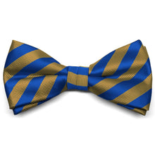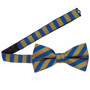 Wear this blue and old gold striped bow tie to work or school. The colors are easy to match to an office wardrobe, but are also a popular school and sports team combination. Alternating ribbed and satin stripes upgrade this bow tie from the standard stripe. Also available in a necktie and pocket square.