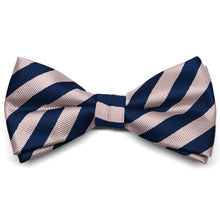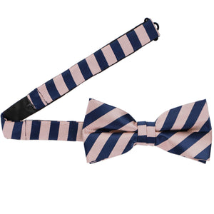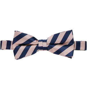 Blush pink and navy blue are two of our most popular colors for weddings and formalwear, meaning this striped bow tie is the perfect match for your big day! This handsome bow tie features alternating smooth satin stripes and woven ribbed stripes. The stripes are just the right size to stand out, but still look stylish and elegant. Matching neckties and pocket squares are available for purchase, so go ahead and mix and match looks among your groom and groomsmen.