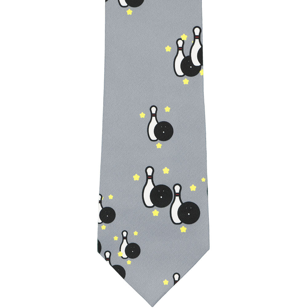 You'll look striking in this bowling necktie! The novelty design features an assortment of bowling balls and pins. If black or gray suits are your go-to then this gray tie will be right up your alley.