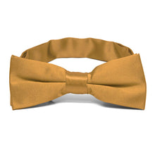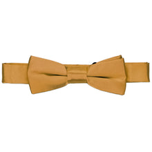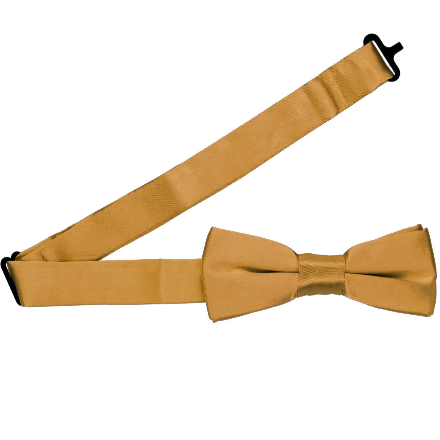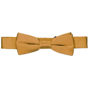 A charming boys' antique gold bow tie sized just right for your little guy. The bow tie is pre-tied and features a safe and easy-to-use, hook-and-eye closure. Measuring 4-inches across and 1.5-inches tall, this bow tie is sized for most boys from baby to 10-years old.