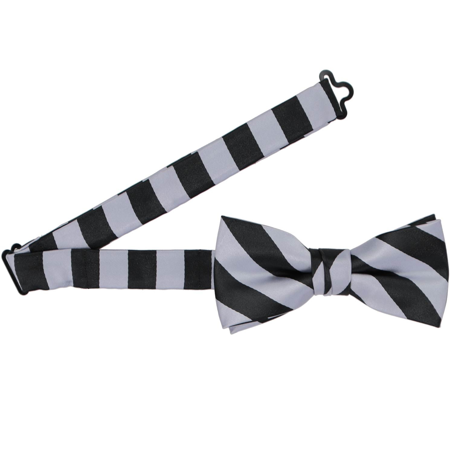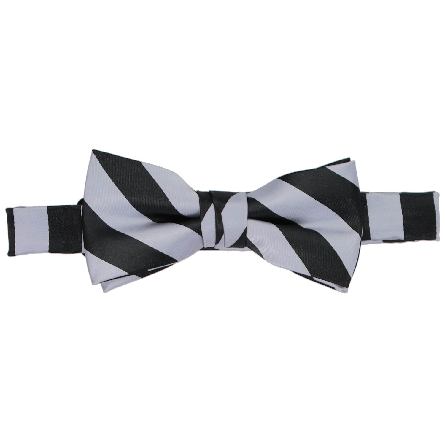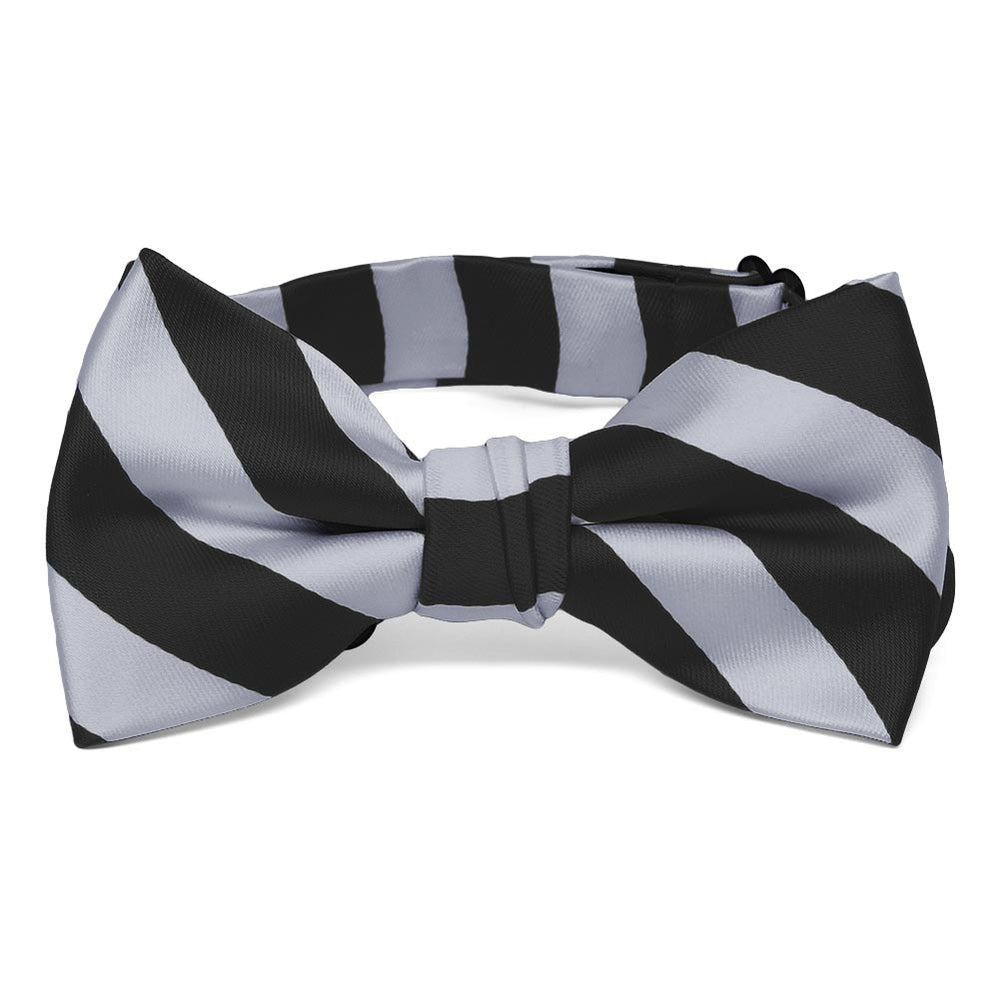 We designed this boys' black and silver striped bow tie to coordinate with our popular men's stripes. At 0.5-inches, the stripes are slightly skinnier than the men's size to be more proportionate for a child. The bow is pre-tied with a band collar sized for most boys from baby to 10-years old. Look for this color combo in a men's necktie, bow tie, skinny tie and pocket square.