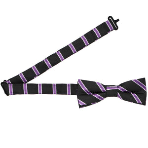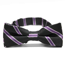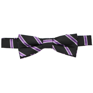 This classic black striped boys' bow tie is the epitome of timeless style. Subtle grape purple, white, and dark gray pencil stripes add just the right touch of sophistication, making it a versatile choice for any occasion. The pre-tied design ensures easy wear, while the adjustable band provides a comfortable fit. A must-have accessory that never goes out of style!