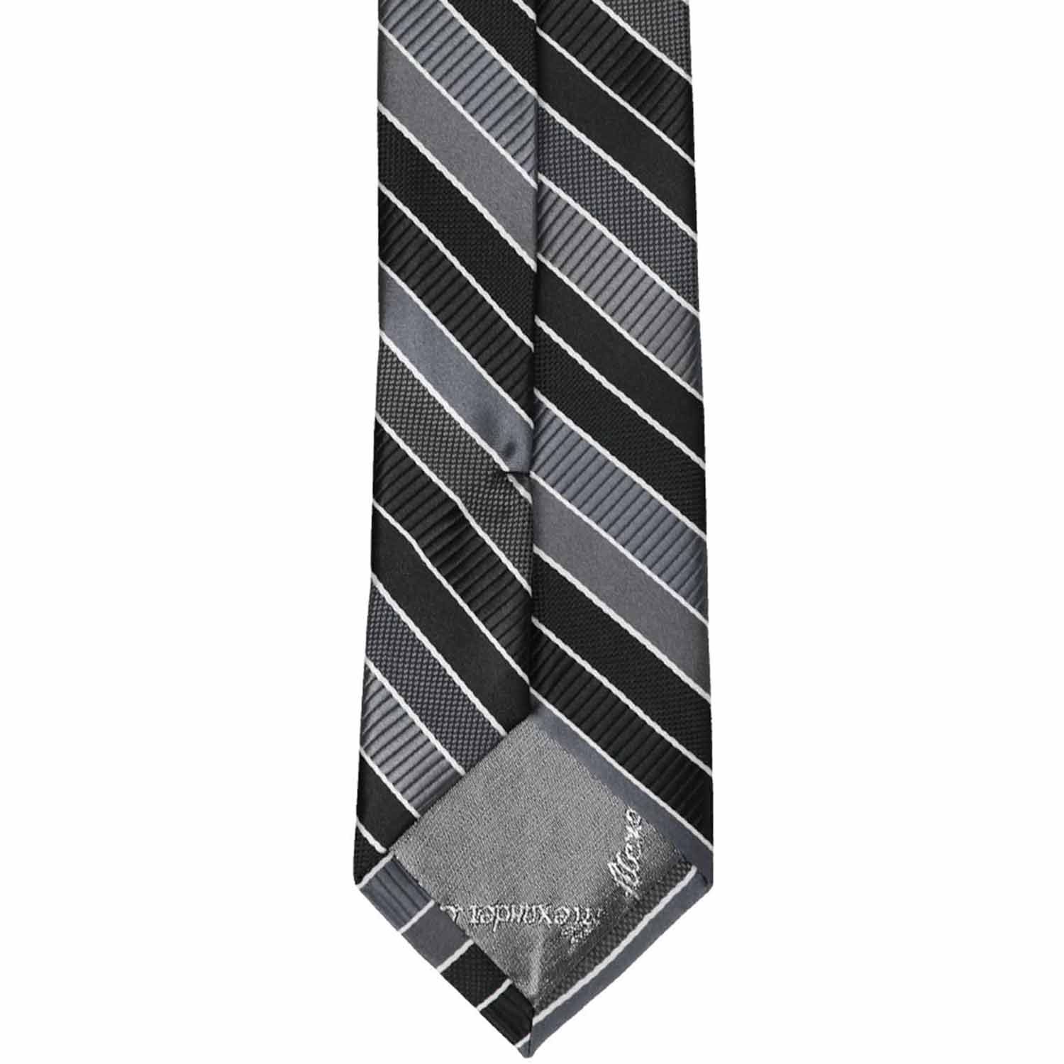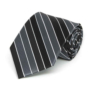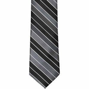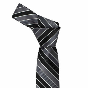 Take a closer look at this versatile boys' tie, perfect for school photos, family portraits, or more somber occasions. It features black and gray stripes in a variety of finishes—ribbed, textured, and smooth satin—highlighted by thin white pencil stripes for added detail. The dark color palette pairs seamlessly with black or dark gray suits, making it a reliable choice for both formal events and times when a more subdued look is needed.