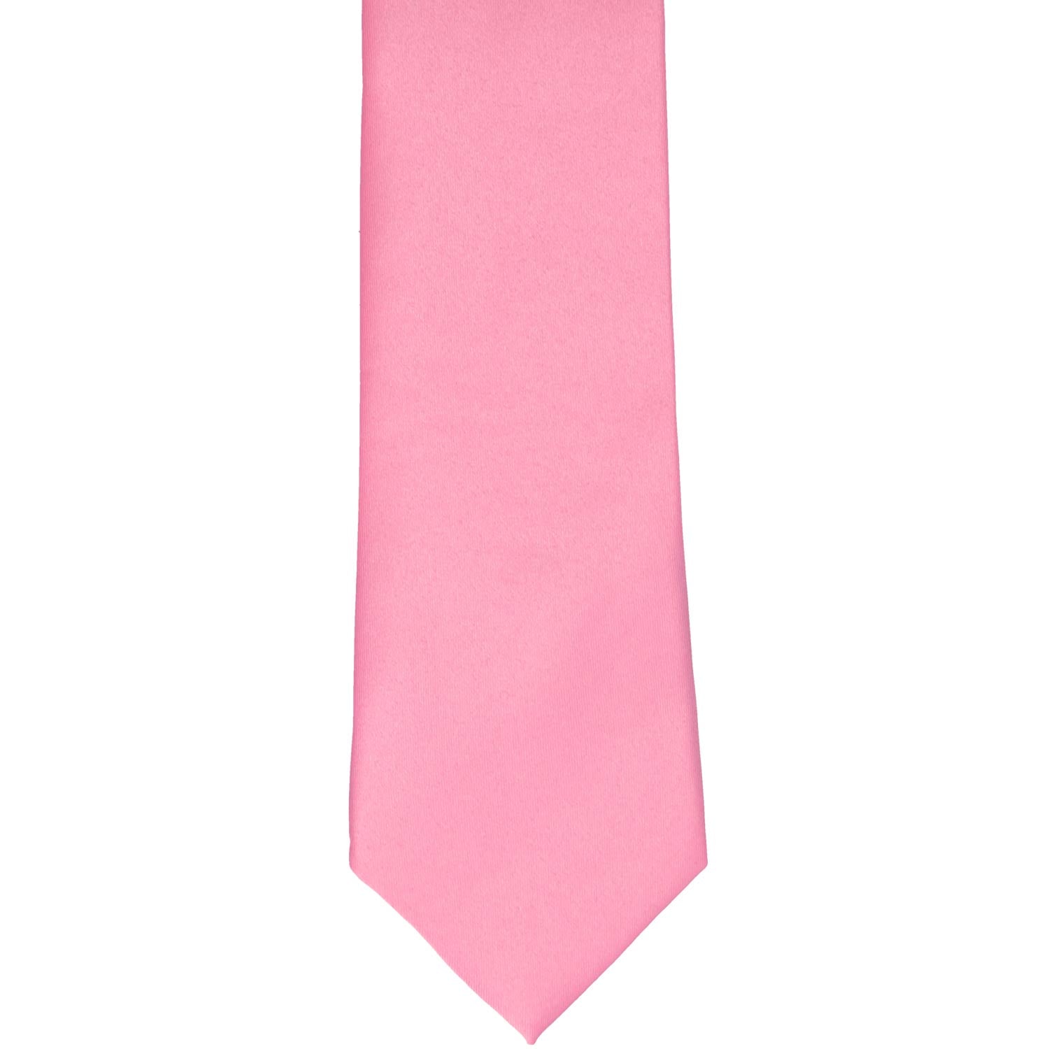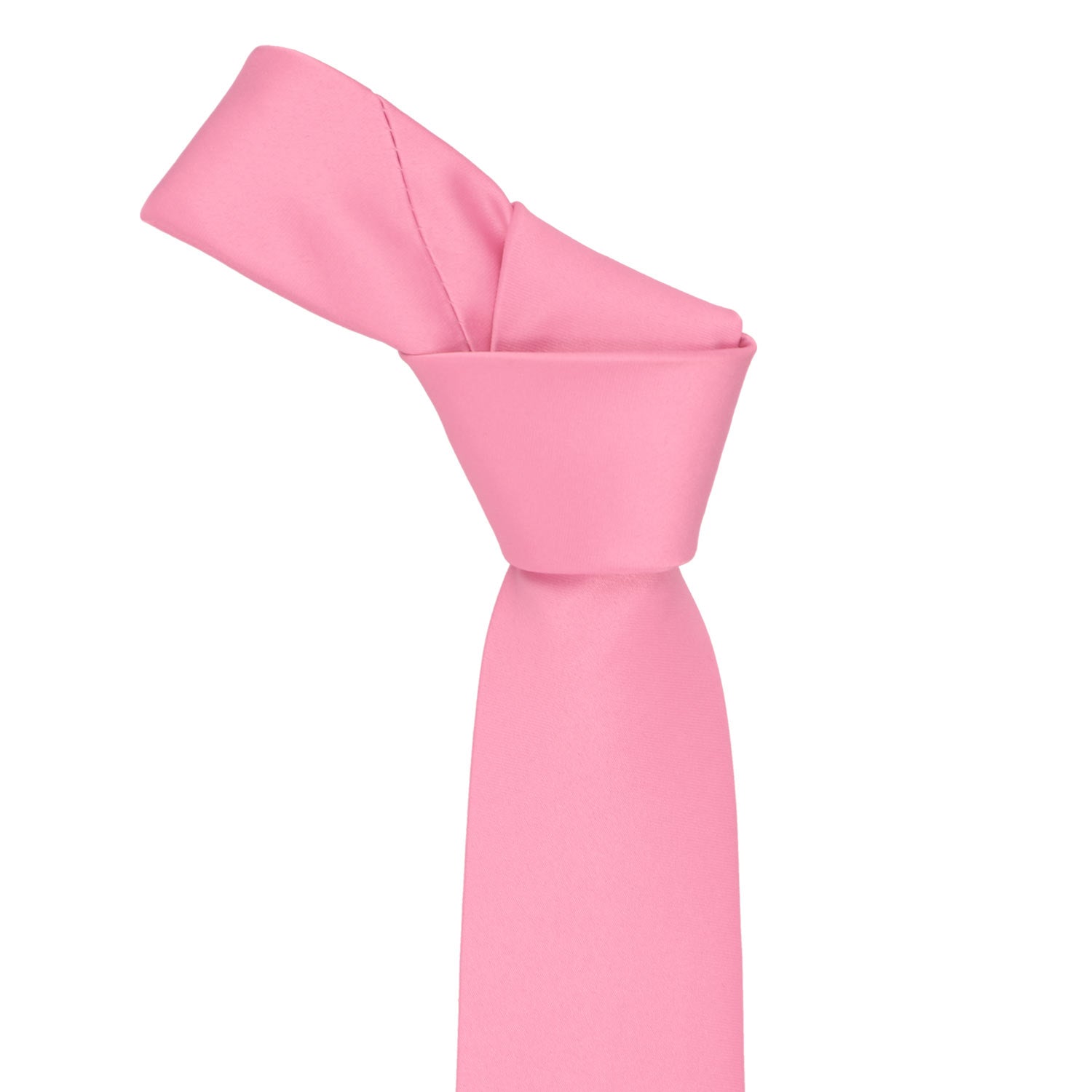 This bubblegum pink boys' necktie is that truly perfect pink shade—not too light, not too bright, and not fuchsia-toned. This eye-catching solid color is a great choice for formal events like wedding season or for group and uniform wear for school or team events. He'll look polished and feel confident when he ties the tie himself.