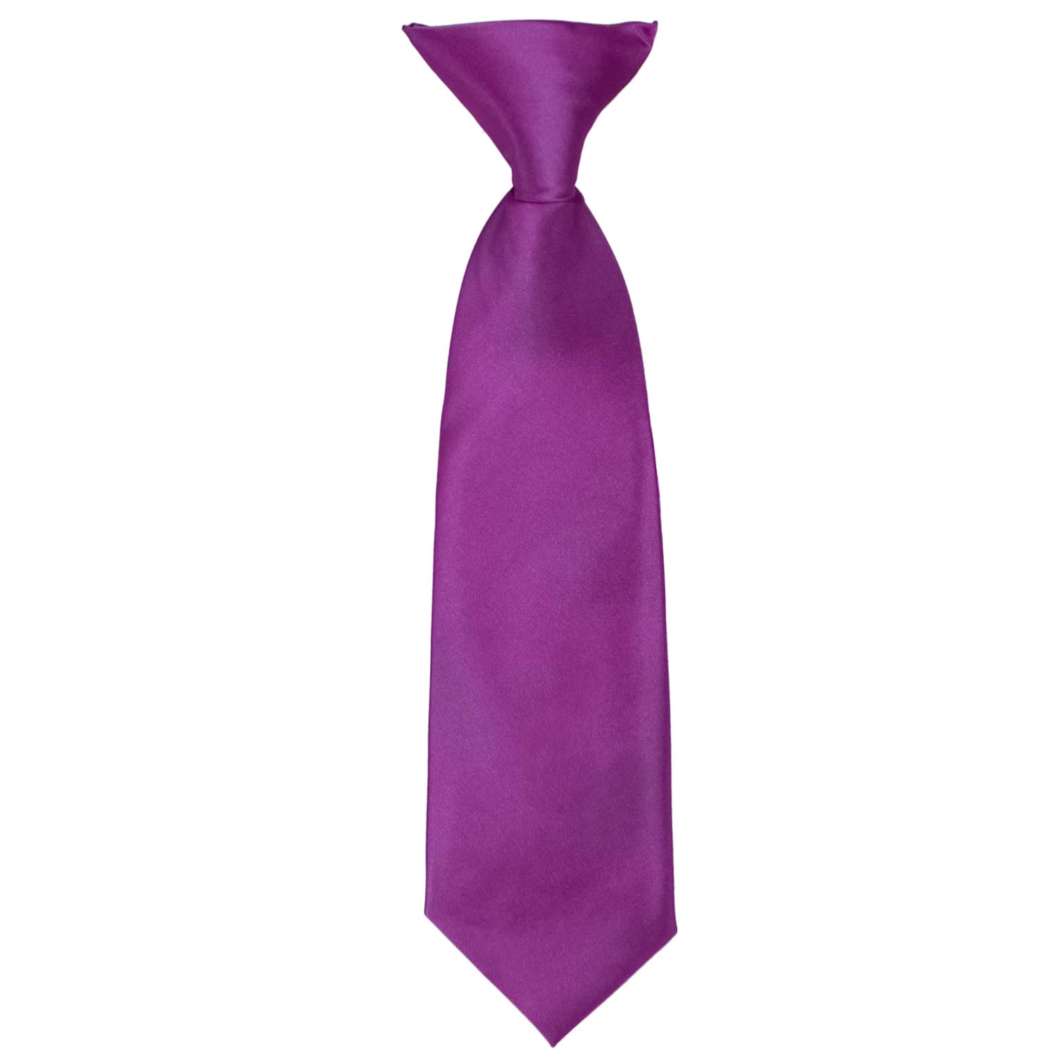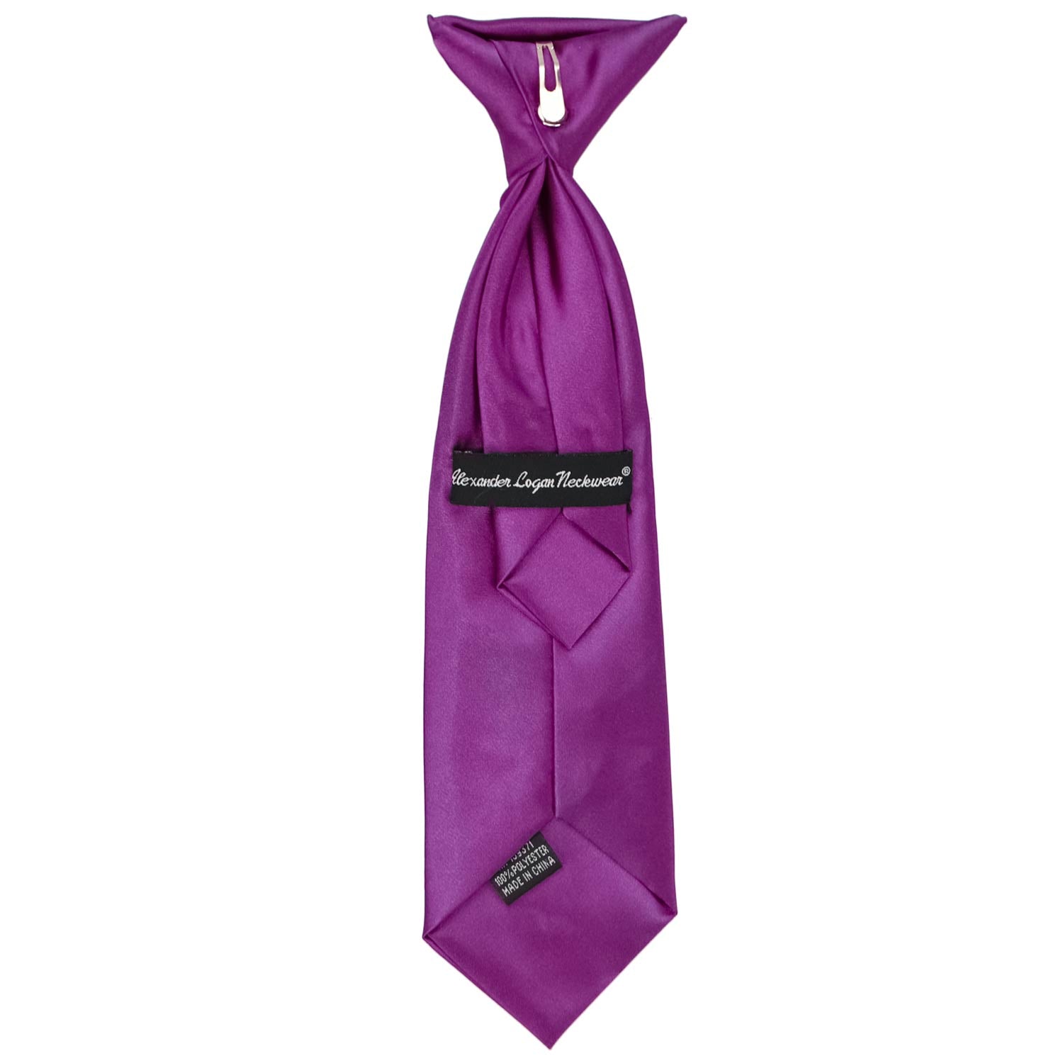 This boys' dark orchid clip-on tie is easy to use and sized just right for your little guy. Available in an 11-inch or 14-inch length, these pre-tied ties are sized to fit most boys 2- to 10-years old. The clip on the tie simply attaches to the top of the boy's shirt, without any material around the neck. This boys' clip-on tie is designed to match our collection of men's solid color neckties.