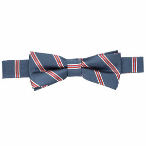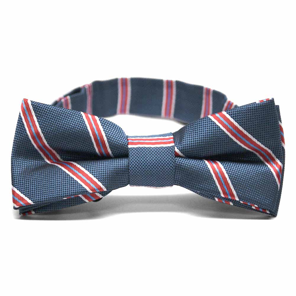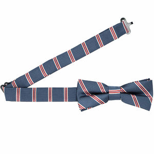 Keep him cool and casual with this boys' denim blue striped bow tie! Red, light blue and white pencil stripes add a playful touch, making it the perfect accessory to pair with jeans for a laid-back yet stylish look. The pre-tied bow and adjustable band ensure an easy, comfortable fit for any occasion.