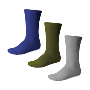 This pack of boys' crew height socks come in three earthy colors: Royal blue, olive green and gray. These are great socks to wear casually to school or dressed up a bit for pictures or family photos. They are a medium weight sock made from a comfortable polyester blend.
