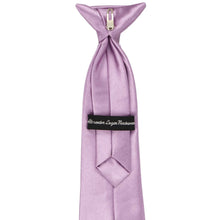 This boys' English lavender clip on tie is easy to use and sized just right for your little guy. Available in an 11-inch or 14-inch length, these pre-tied ties are sized to fit most boys 2 to 10-years old. The clip on the tie simply attaches to the top of the boy's shirt, without any material around the neck. This boys' clip-on tie is designed to match our collection of men's solid color neckties.