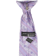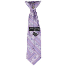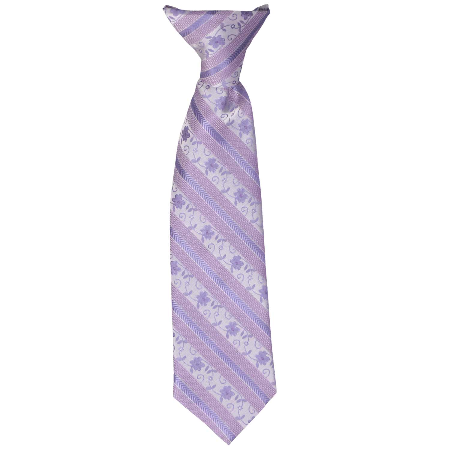 Clip and go! You'll both appreciate the ease of this pre-tied tie. It arrives already knotted so it simply clips to the top of his shirt collar-without any material around the neck. We get into sizing details below, but there are three sizes available to fit children up to about 10. (Each features a traditional width.) Made from durable polyester with a stylish textured finish.