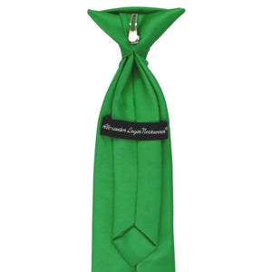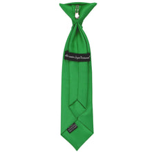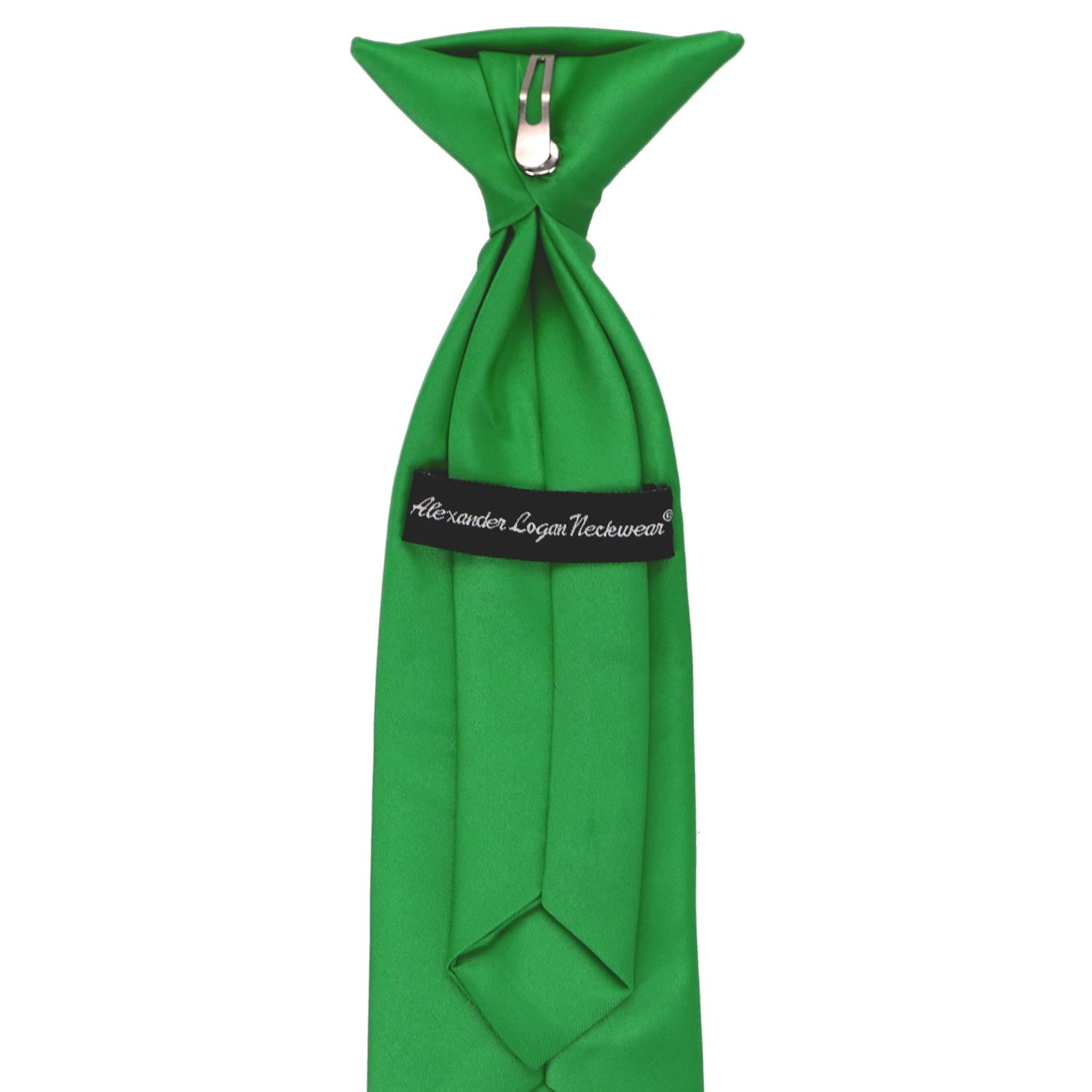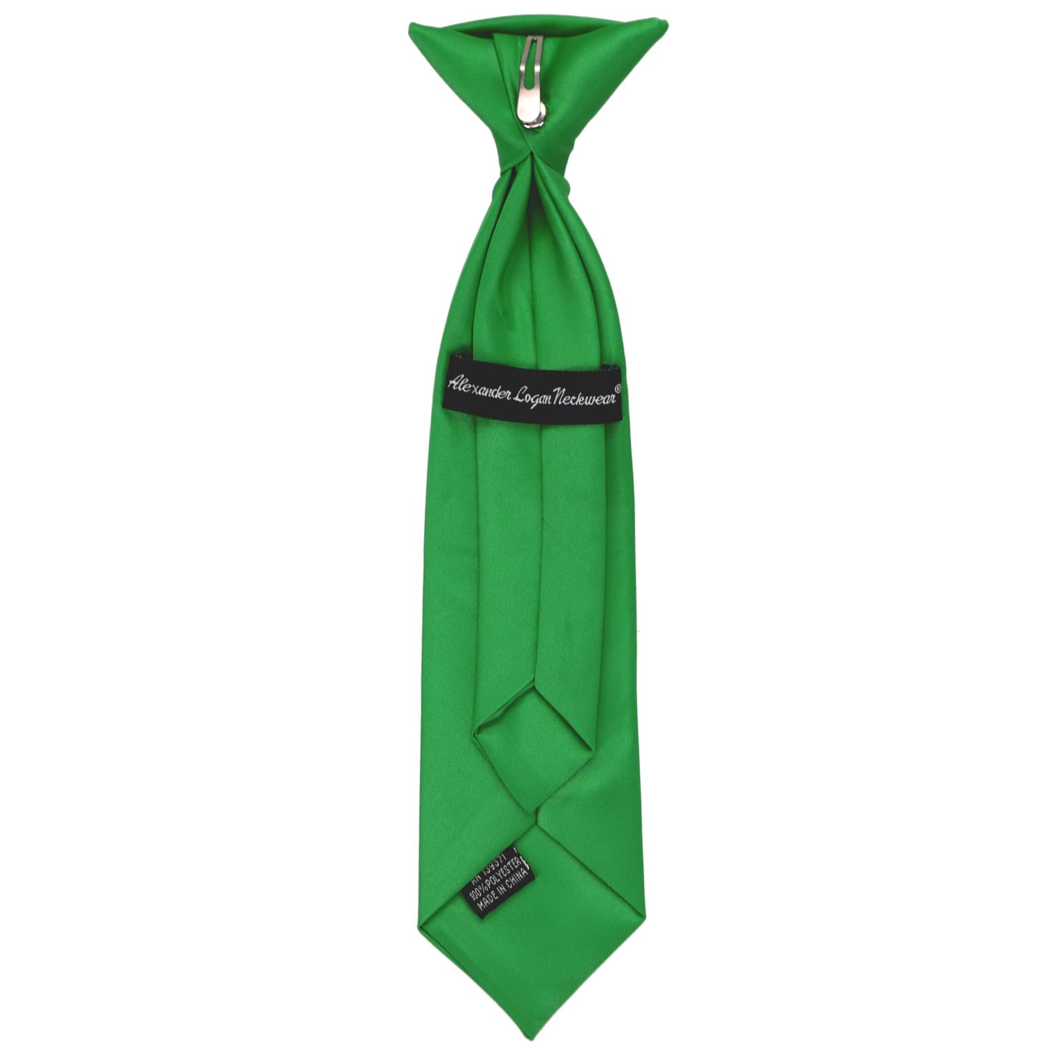 This boys' Irish green clip-on tie is easy to use and sized just right for your little guy. Available in an 11-inch or 14-inch length, these pre-tied ties are sized to fit most boys 2 to 10-years old. The clip on the tie simply attaches to the top of the boy's shirt, without any material around the neck. This boys' clip-on tie is designed to match our collection of men's Irish green solid color neckties.