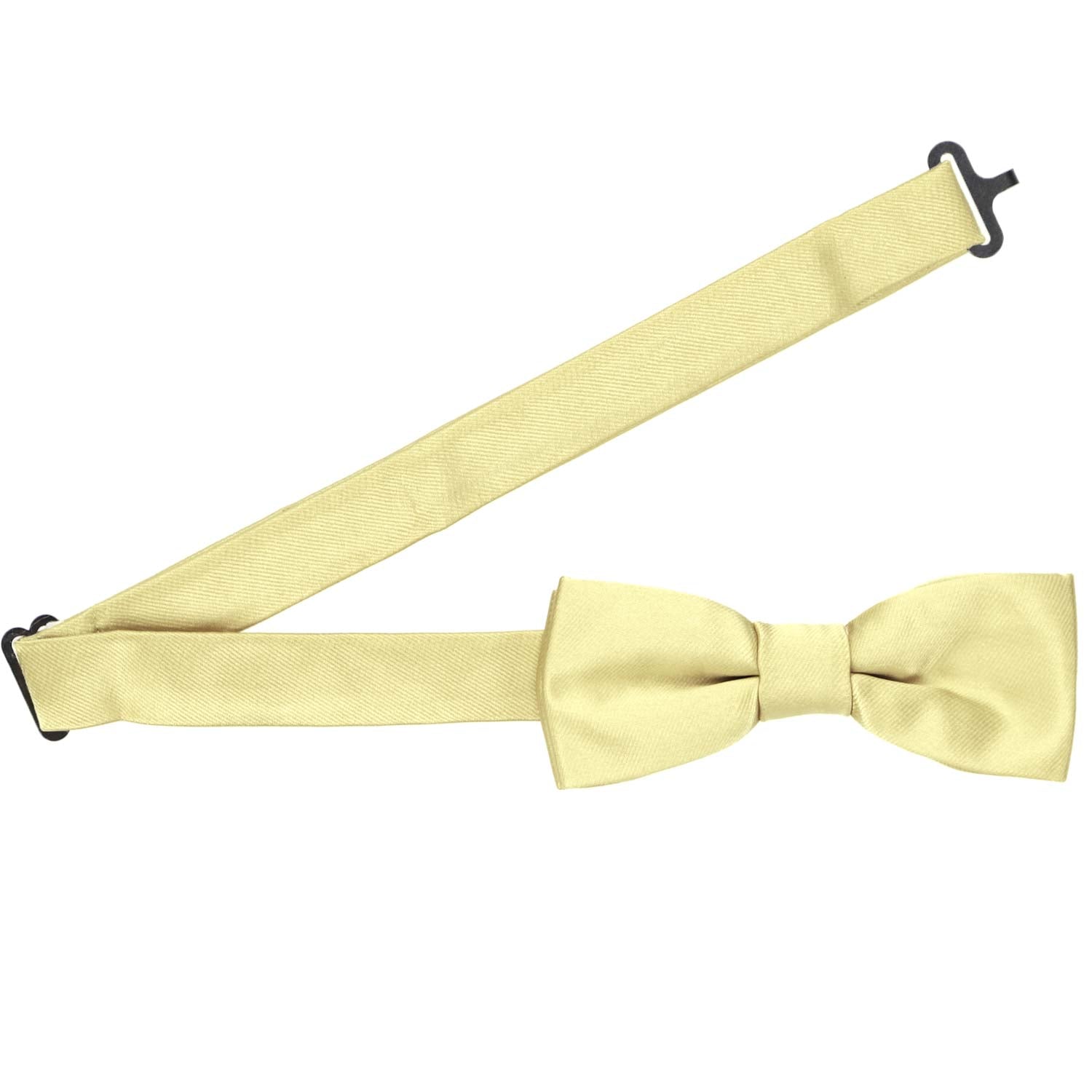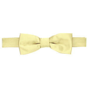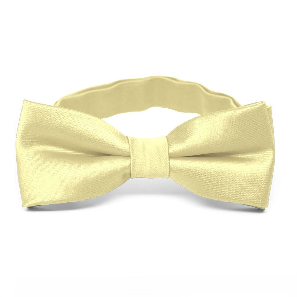 A charming boys' light yellow bow tie sized just right for your little guy. Made from heavyweight woven material with slight ribbing. The bow tie is pre-tied and features a safe and easy-to-use hook-and-eye closure. Measuring 4-inches across and 1.5-inches tall, this boys' bow tie is sized for boys from baby to 10-years old.