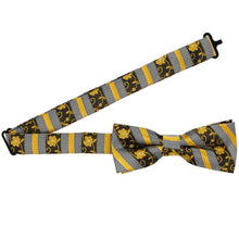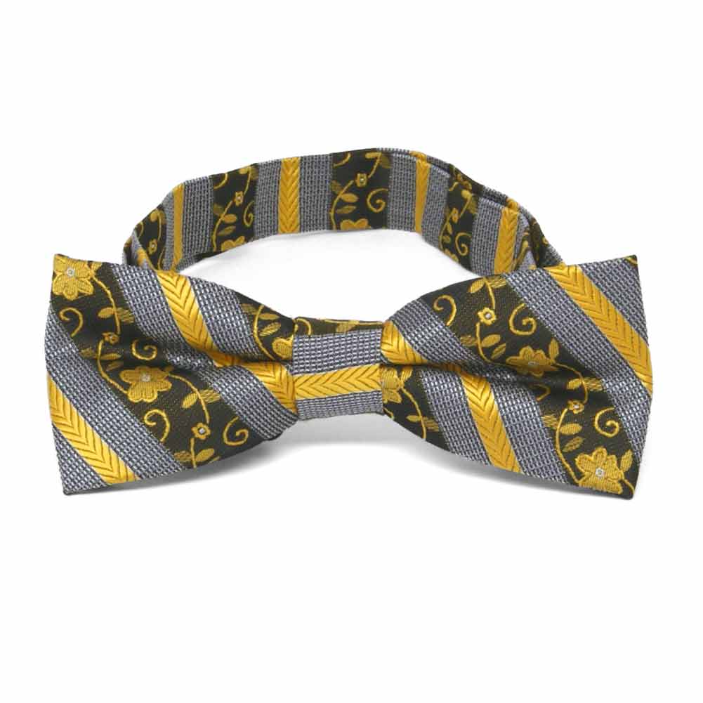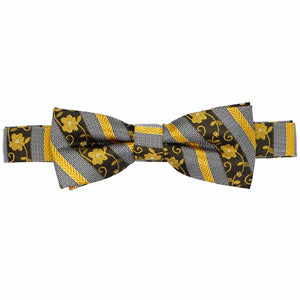 This marigold yellow and gray boys' bow tie features a sophisticated alternating pattern of delicate floral vines and textured stripes. The warm marigold hue is beautifully balanced by cool gray tones, creating a refined and versatile accessory perfect for both formal events and stylish everyday wear. The intricate floral details add a touch of elegance, while the stripes offer a modern contrast, making this bow tie a charming addition to any young gentleman’s wardrobe.