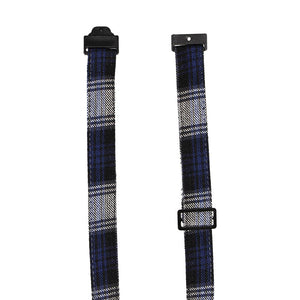 Front of a boys navy blue plaid necktie