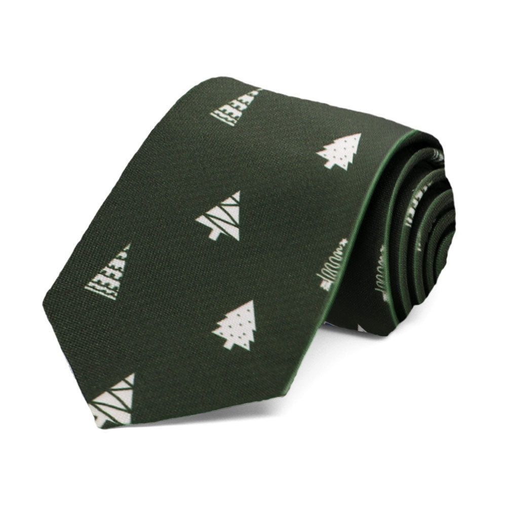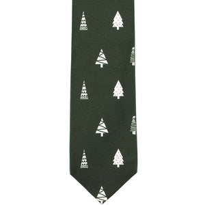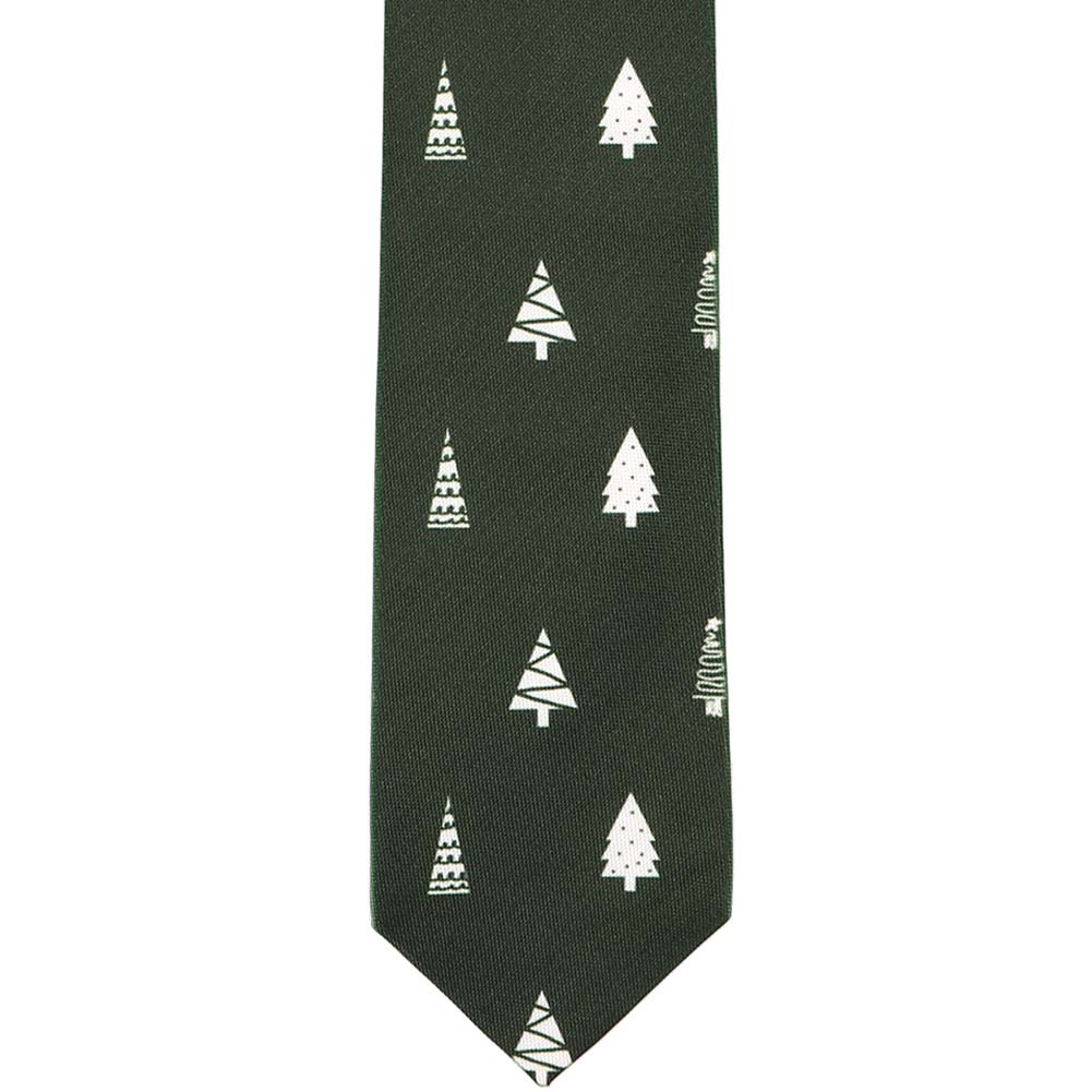 Whether you're outfitting a group of young carolers or coordinating a family holiday photo session, this tasteful Christmas tree necktie will have even your littlest guy looking dapper. Assorted white decorated Christmas trees are scattered across a dark army green background for a festive, but not over the top look. Matching adult sizes and other styles are available for purchase.