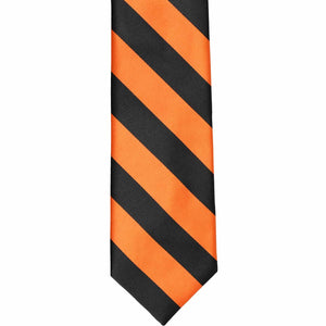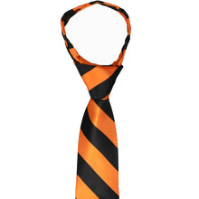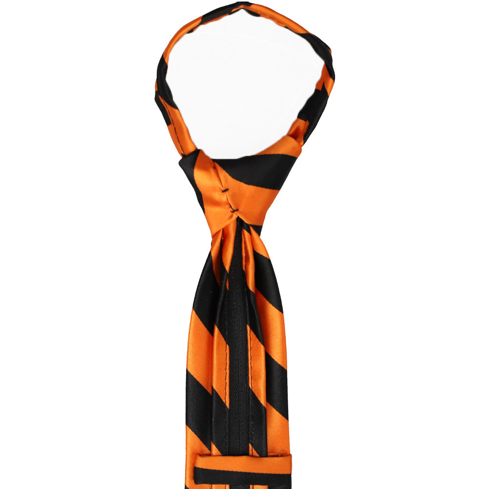Perfect for school uniforms! This pre-tied orange and black striped tie is sized to fit most boys 6 to 10-years old. (For the best fit, measure the child from the top of the collar to the waist.) The kid-friendly tie is easy to use and looks just like a standard necktie when worn. The secret is a zipper in the tie tail that allows the collar to quickly expand and fit over the head without having to tie a knot. Longer sizes for men and teens available for purchase.