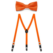A boys' orange bow tie with matching orange suspenders