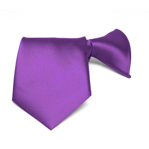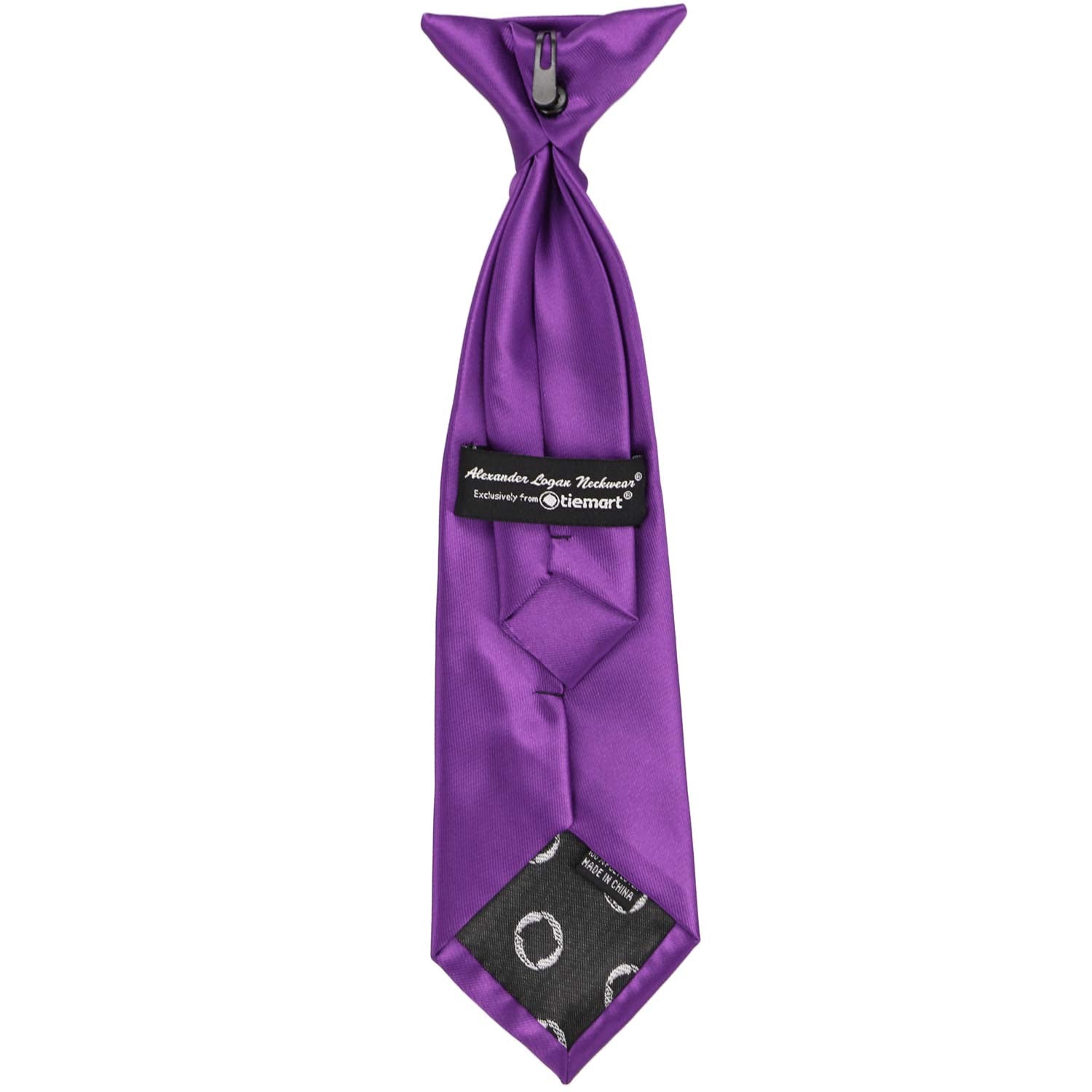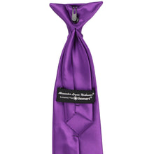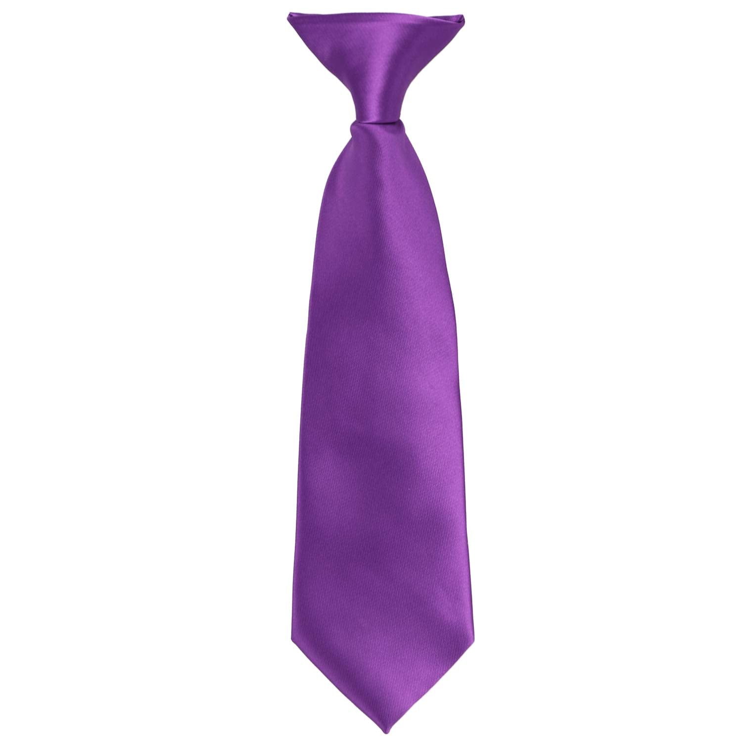 This boys' plum violet clip-on tie is pre-tied and easy to use. It's made from durable and heavyweight woven material with slight ribbing. Pre-tied and available in an 11-inch length for boys 2 to 5-years old. The clip on the tie simply attaches to the top of the boy's shirt, without any material around the neck. Matching men's ties available.
