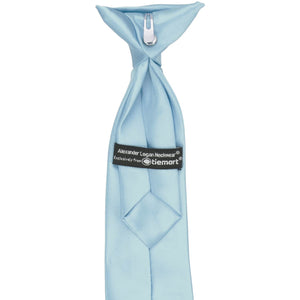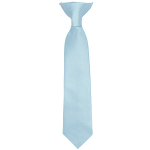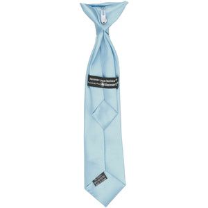 This boys' powder blue clip-on tie is pre-tied and easy to use. It's made from durable and heavyweight woven material with slight ribbing. Choose from an 11-inch or 14-inch length for boys 2 to 10-years old. The clip on the tie simply attaches to the top of the boy's shirt, without any material around the neck. Matching men's ties available.