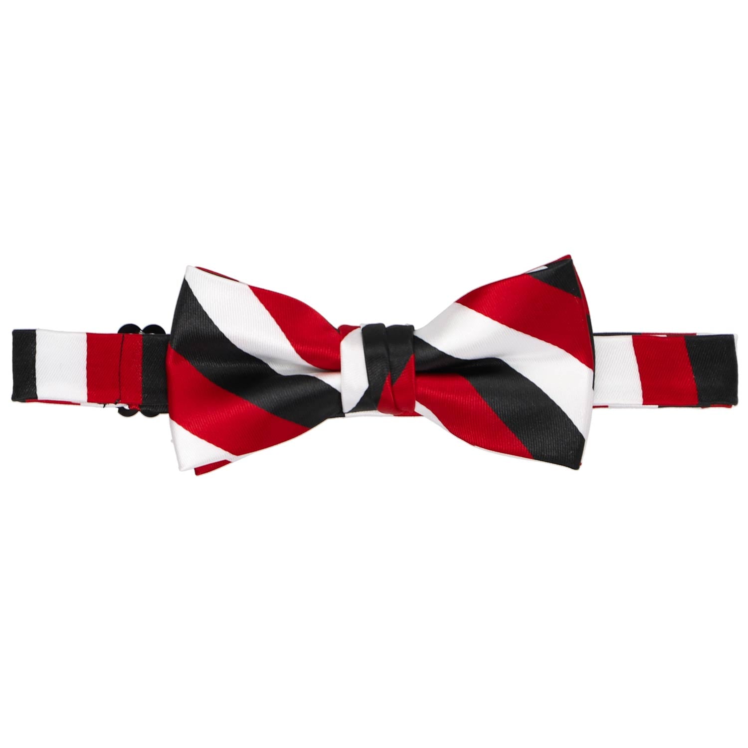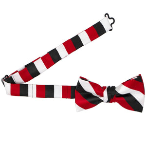 Two colors just weren't enough, so we added a third to this boys' red, black and white bow tie. The result is classic, from the colors to the size of the stripes. This bow tie is available in a men's/teen size too, making it easy to put together a matching look among a family or wide range of school-age kids.