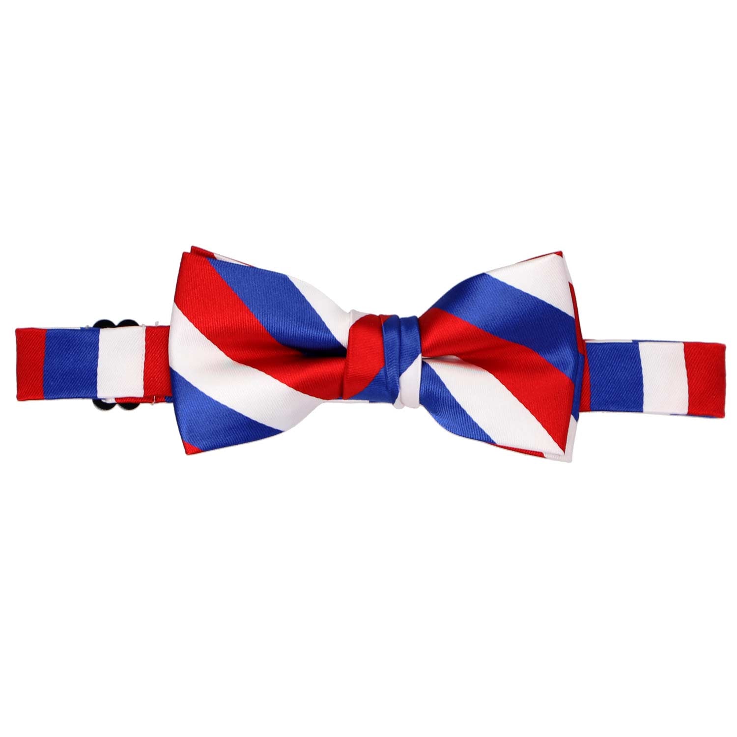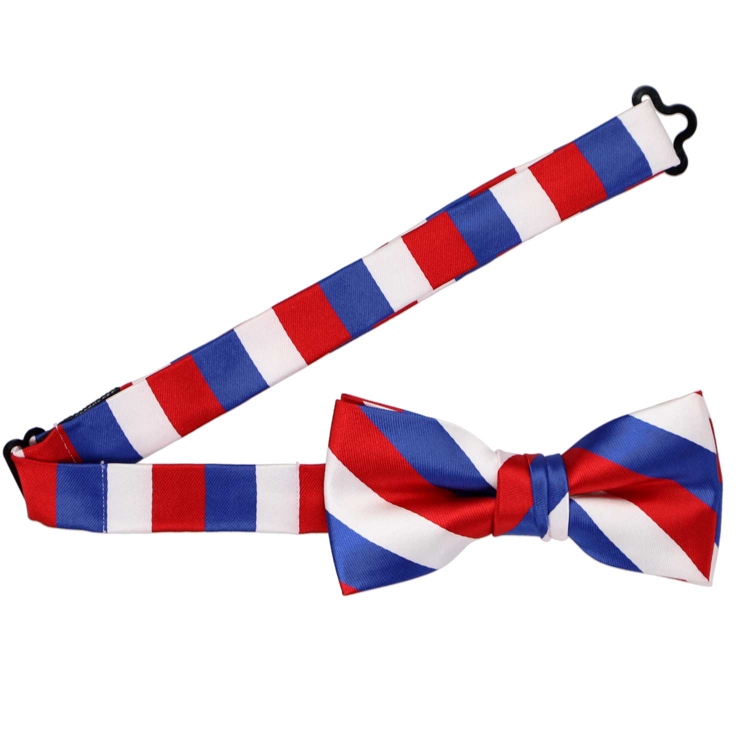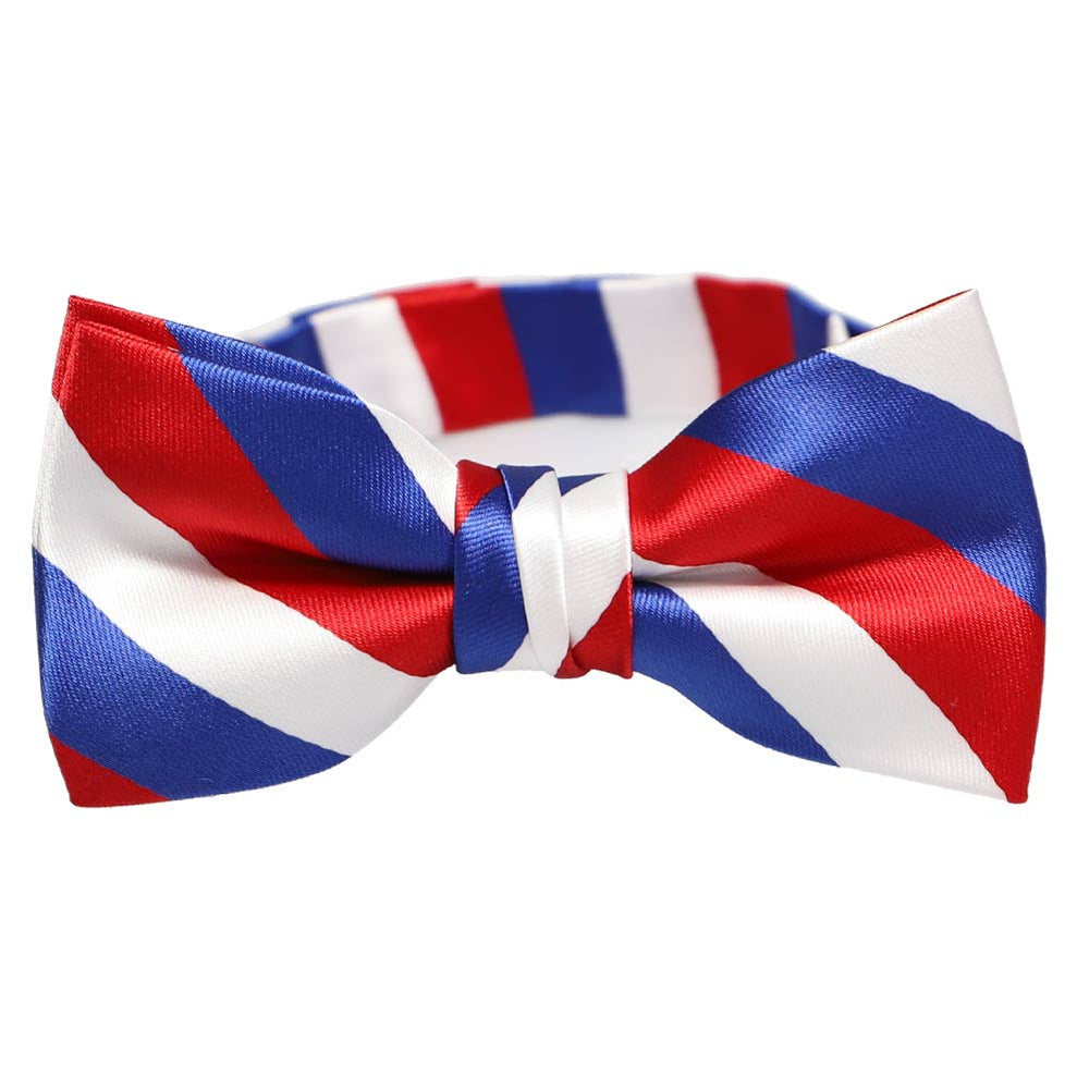 This boys' patriotic red, white, and blue bow tie was designed to match with our popular men's ties. The bow is pre-tied with a band collar sized for most boys from baby to 10-years old. The heavyweight woven material and smooth satin finish provide a sharp look that is suited for any occasion.