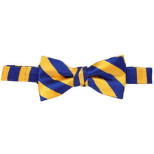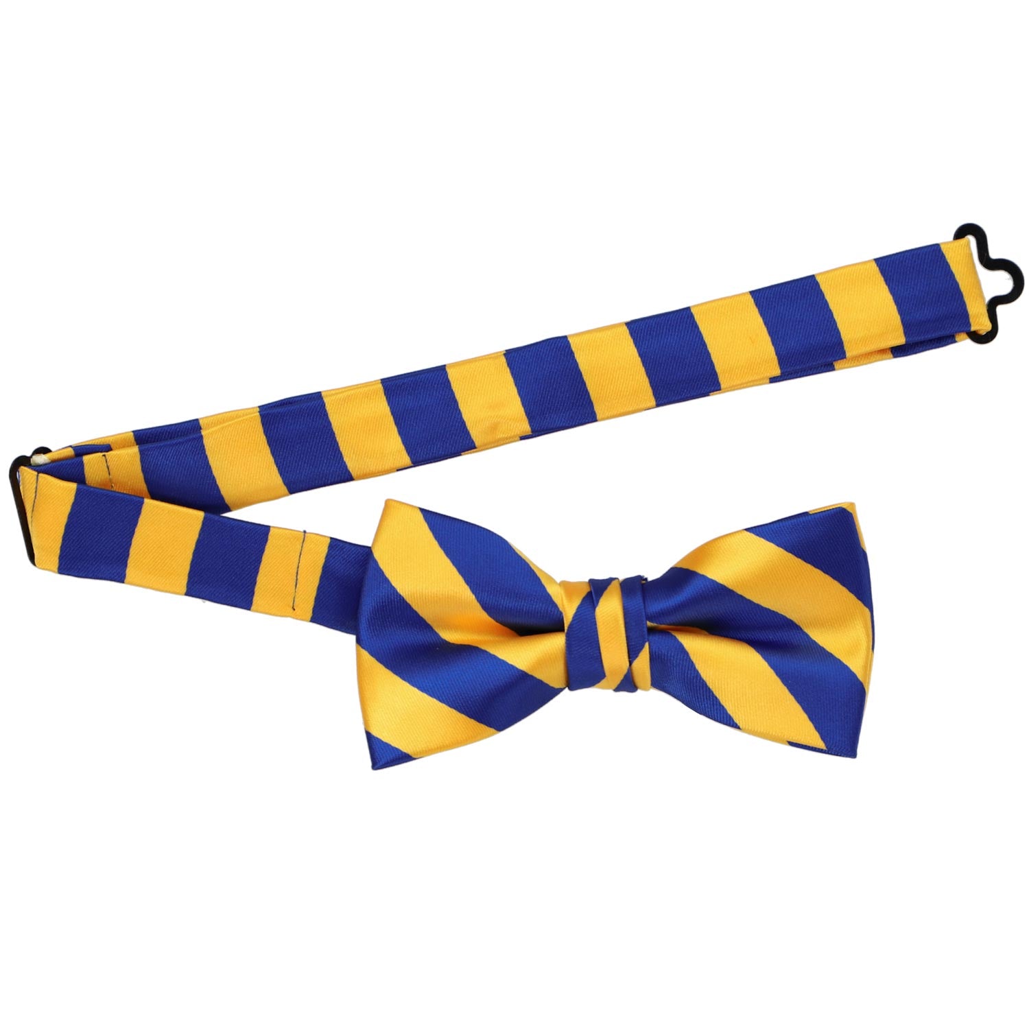 We designed this boys' royal blue and golden yellow striped bow tie to coordinate with our popular men's stripes. At 0.5-inches, the stripes are slightly skinnier than the men's size to be more proportionate for a child. The bow tie is made from a heavyweight woven material that's quite durable for children.