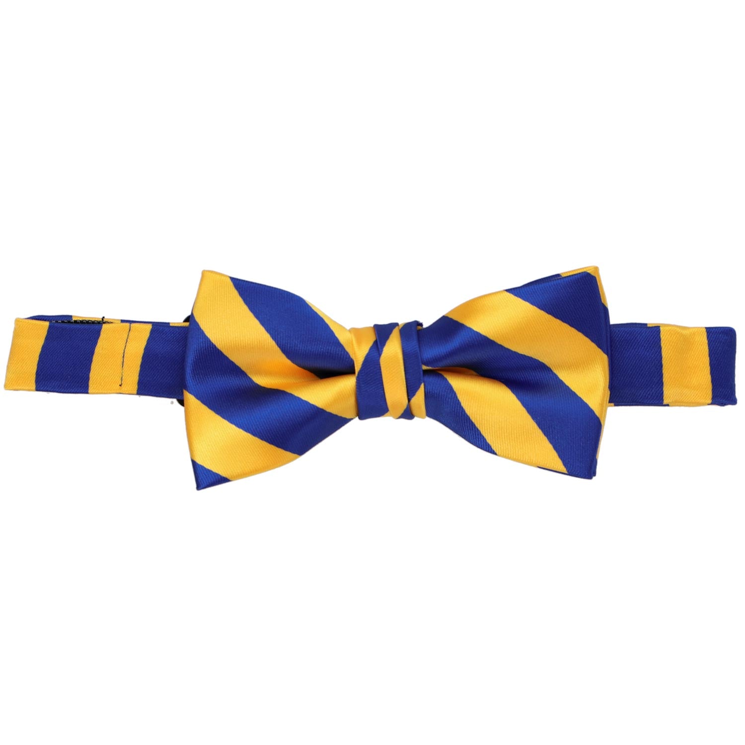 Whether he's heading to school, supporting a cause or simply dressing up in his favorite colors, your young man will look seriously dapper in this royal blue and golden yellow striped bow tie. The pre-tied style is easy to put on, while staying securely in place, even for little ones. These bow ties look great with a classic suspenders and slacks combo, dark denim and a button down or a dressier suit.