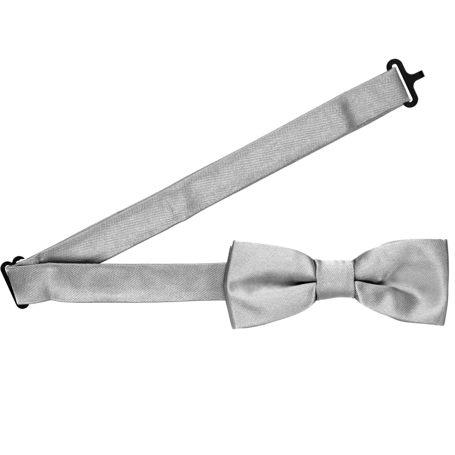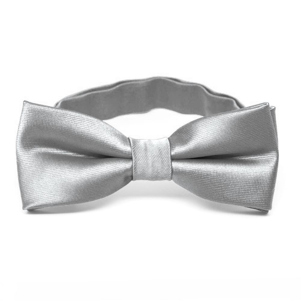 A charming boys' silver bow tie sized just right for your little guy. Made from heavyweight woven material with slight ribbing. The bow tie is pre-tied and features a safe and easy-to-use hook-and-eye closure. Measuring 4-inches across and 1.5-inches tall, this boys' bow tie is sized for boys from baby to 10-years old.