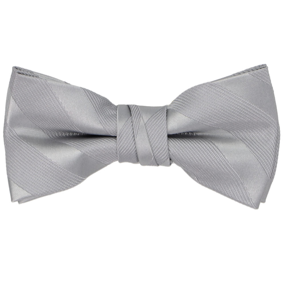 Our boys' silver elite striped bow tie was specially designed to coordinate flawlessly with our popular line of men's elite striped ties. It's the ultimate bow tie to make your ring bearer shine, but the neutral color means it can be worn so many other places: Family photos, piano recitals, holiday events, and more!