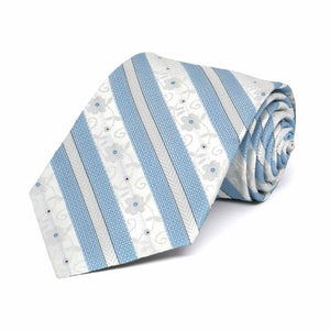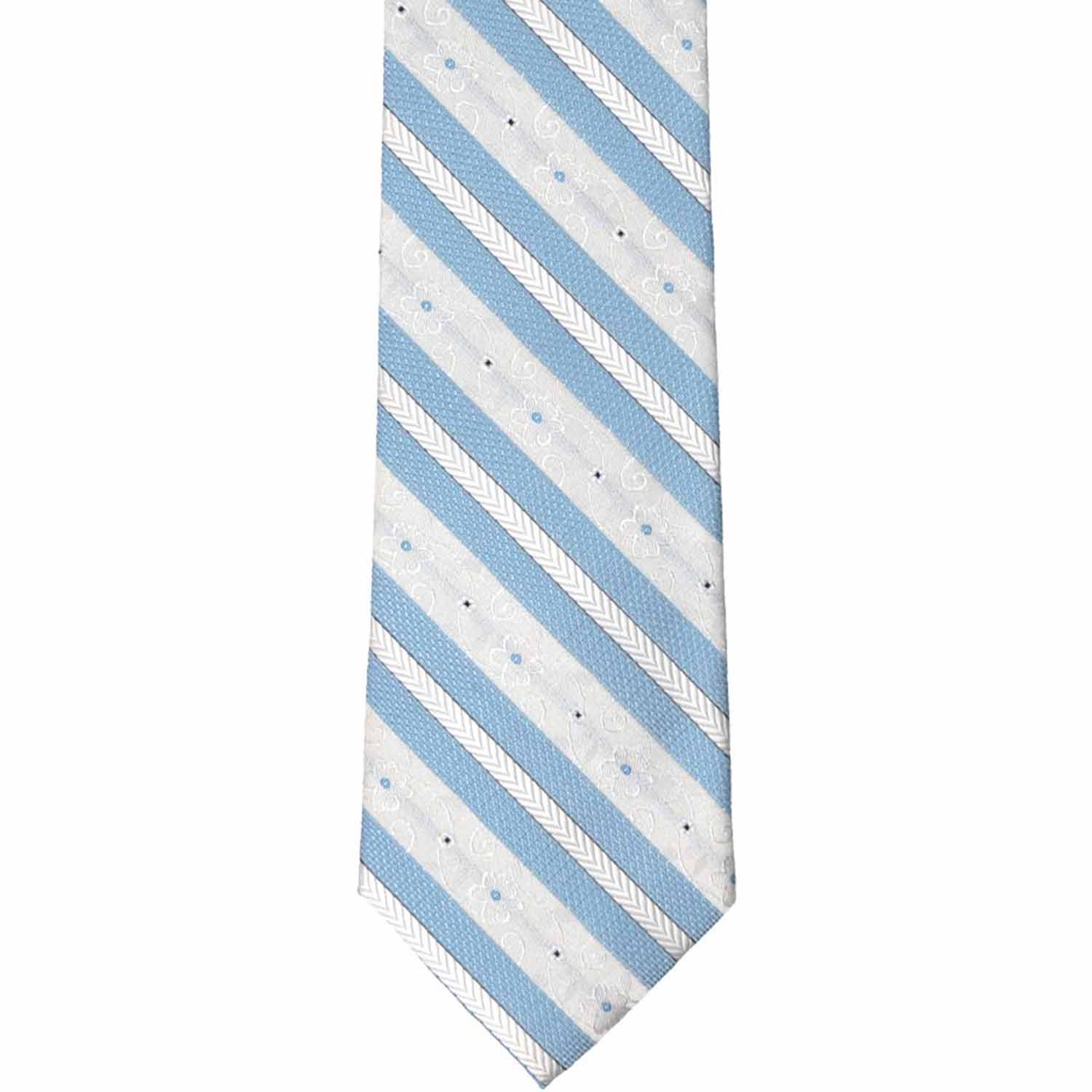 Welcome sunny days and spring celebrations with this sky blue boys' tie featuring a floral stripe pattern. Perfect for Easter, spring weddings, or any special occasion, it adds a pop of color to his outfit. The soft, light blue tones pair beautifully with lighter suits—think light gray or tan—for a fresh, seasonal look. Complete the ensemble with the matching pocket square (sold separately) for that perfect finishing touch!