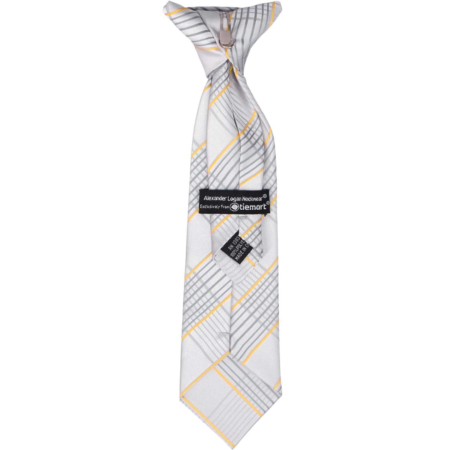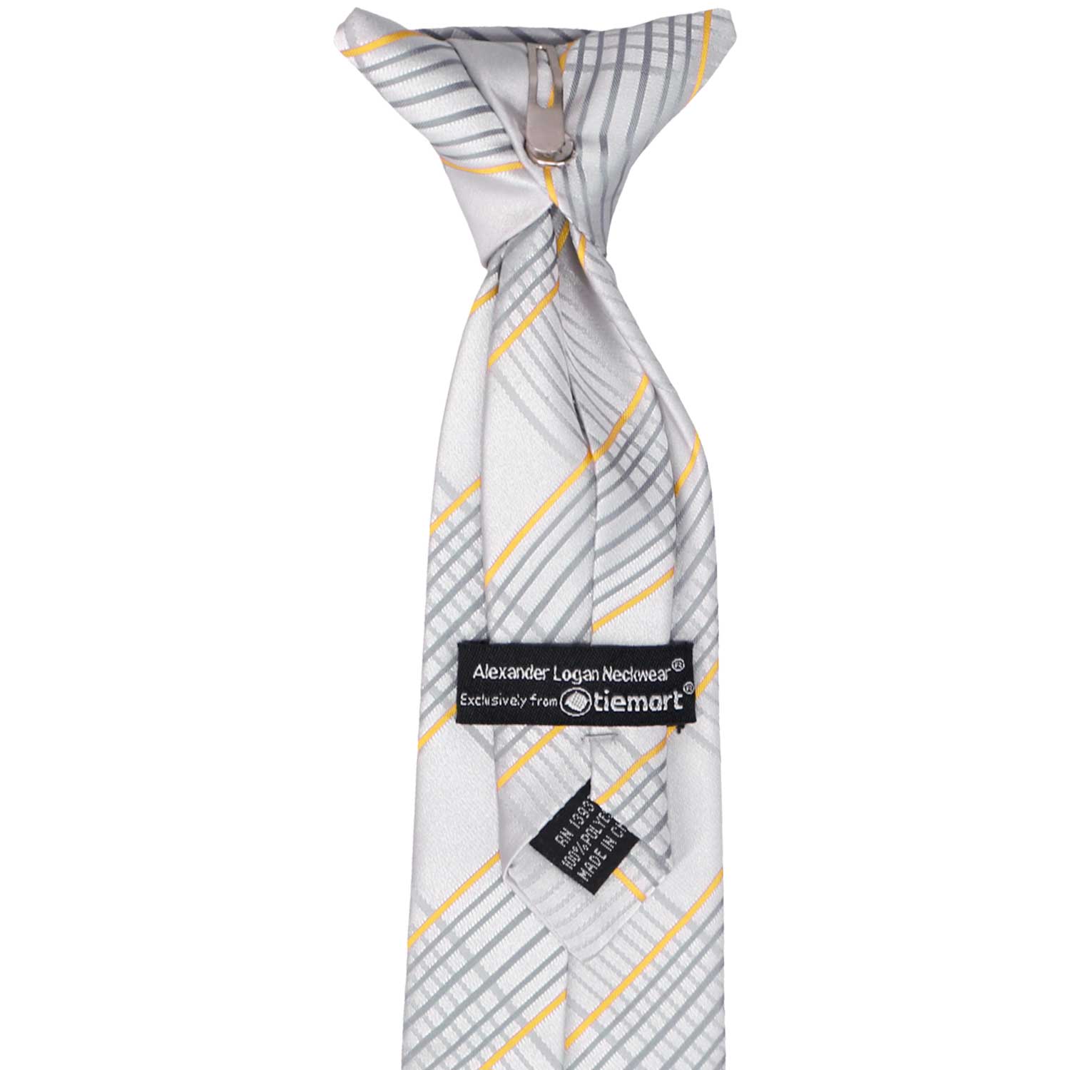 Getting him dressed up is a breeze with this pre-tied clip-on tie! Arriving perfectly knotted, it simply clips to the top of his shirt collar-with no material around the neck needed. Available in three sizes to fit boys from baby to age 10 (see sizing details below). It's made from durable polyester with a stylish textured finish for convenience and charm.