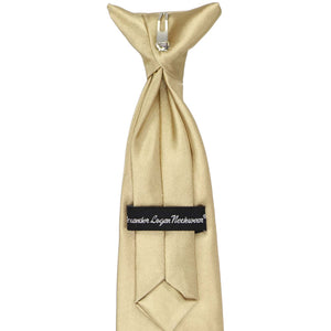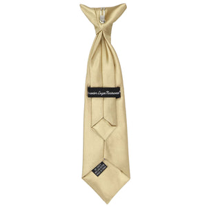 This boys' sparkling champagne tie has a soft, silky feel with a satin shine. The clip is easy to use and safely attaches to the top of the boys' shirt, without any material around the neck. Available in an 11-inch or 14-inch length, these pre-tied ties are sized to fit most boys from 2 to 10-years old. Matching adult sizes and styles available for purchase.