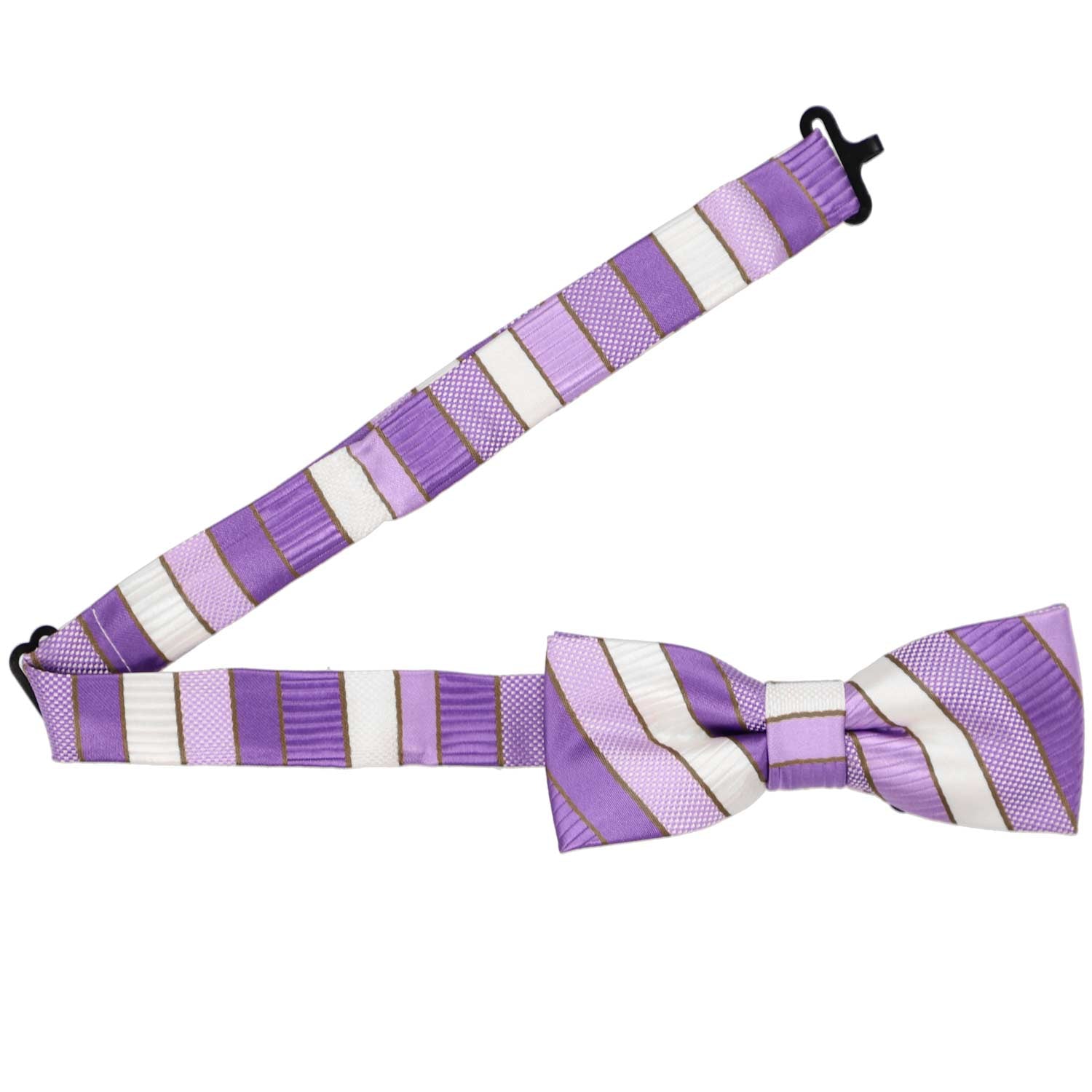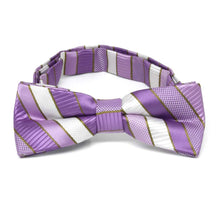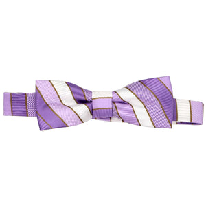 Refresh his spring wardrobe with this thistle purple striped boys' bow tie, accented with delicate gold and white stripes for a touch of refined charm. Perfect for Easter, spring celebrations, or his Sunday best, its sophisticated design complements a variety of outfits while looking especially polished with a gray suit. Matching sizes are available for Dad!