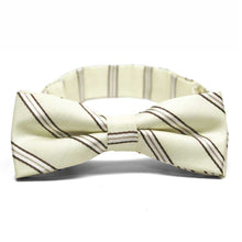 Perfect for a rustic wedding or outdoor celebration, this boys' bow tie combines timeless sophistication with earthy charm. Soft ivory and light brown pencil stripes create a warm, inviting look that complements natural settings beautifully. Whether he’s the ring bearer or a guest, this bow tie adds a refined yet relaxed touch to his outfit—making it an ideal accessory for nature-inspired occasions.