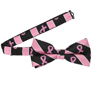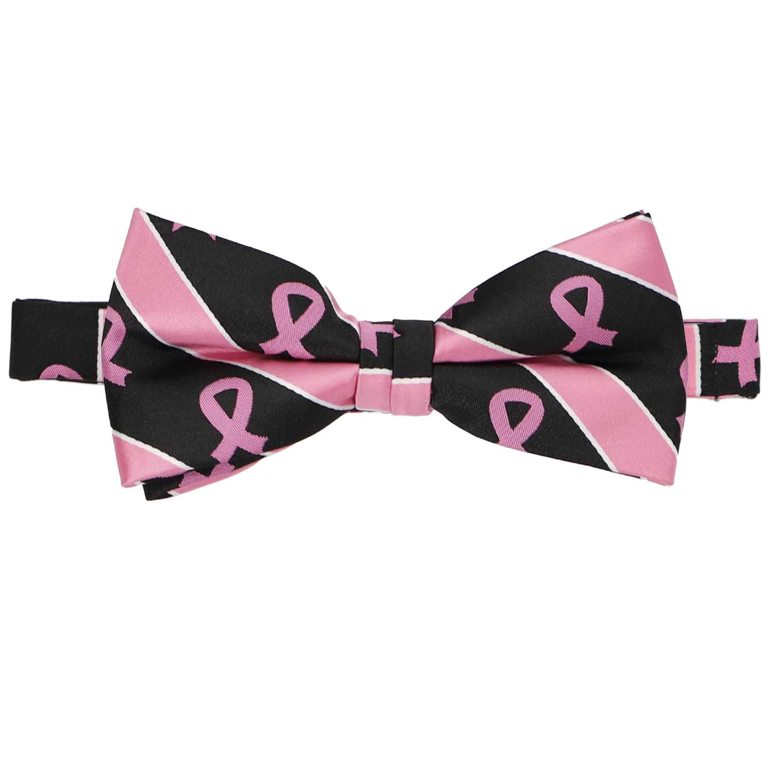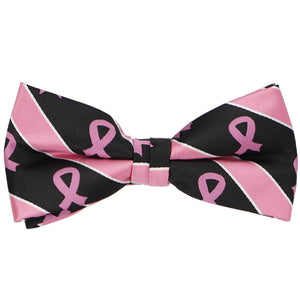Show your support in the fight against Breast Cancer with this pink and black bow tie. The design is elegant, featuring alternating stripes and pink ribbons. It's versatile, too. Our customers are wearing it to the office and for Breast Cancer Awareness events and fundraisers. During the month of October, add the coordinating pink ribbon socks (sold separately) to your outfit.