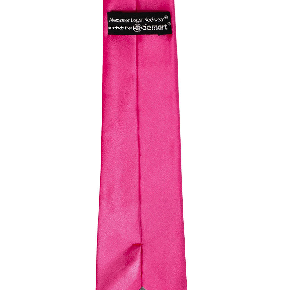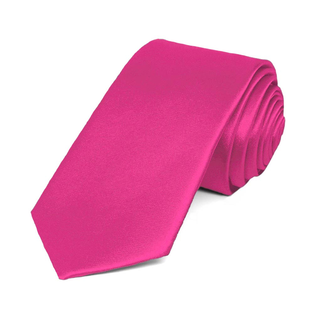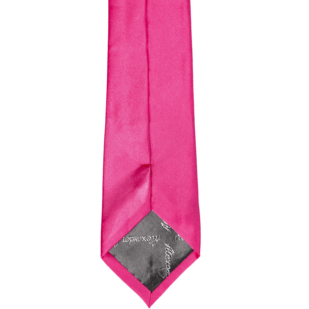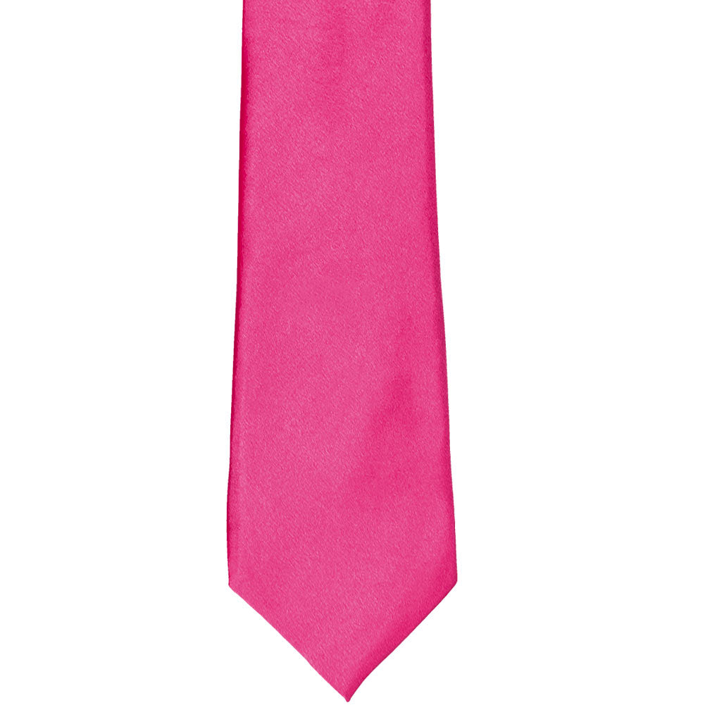 This bright fuchsia slim necktie provides a subtly trendy look without going too skinny. The approximate, 2.5-inch width measures 0.5-inches wider than today's ultra-trendy skinny ties, but about 1-inch skinnier than a traditional men's tie. The in-between width makes it a popular necktie for fashionably outfitting a large group of different sized adults or teens.