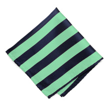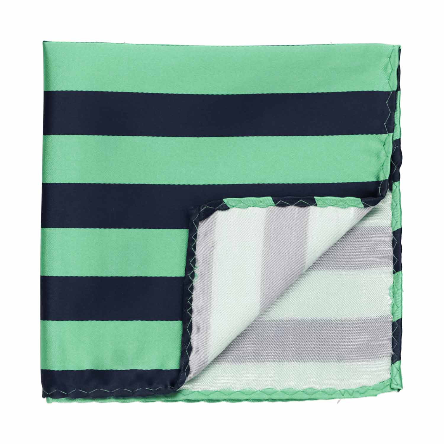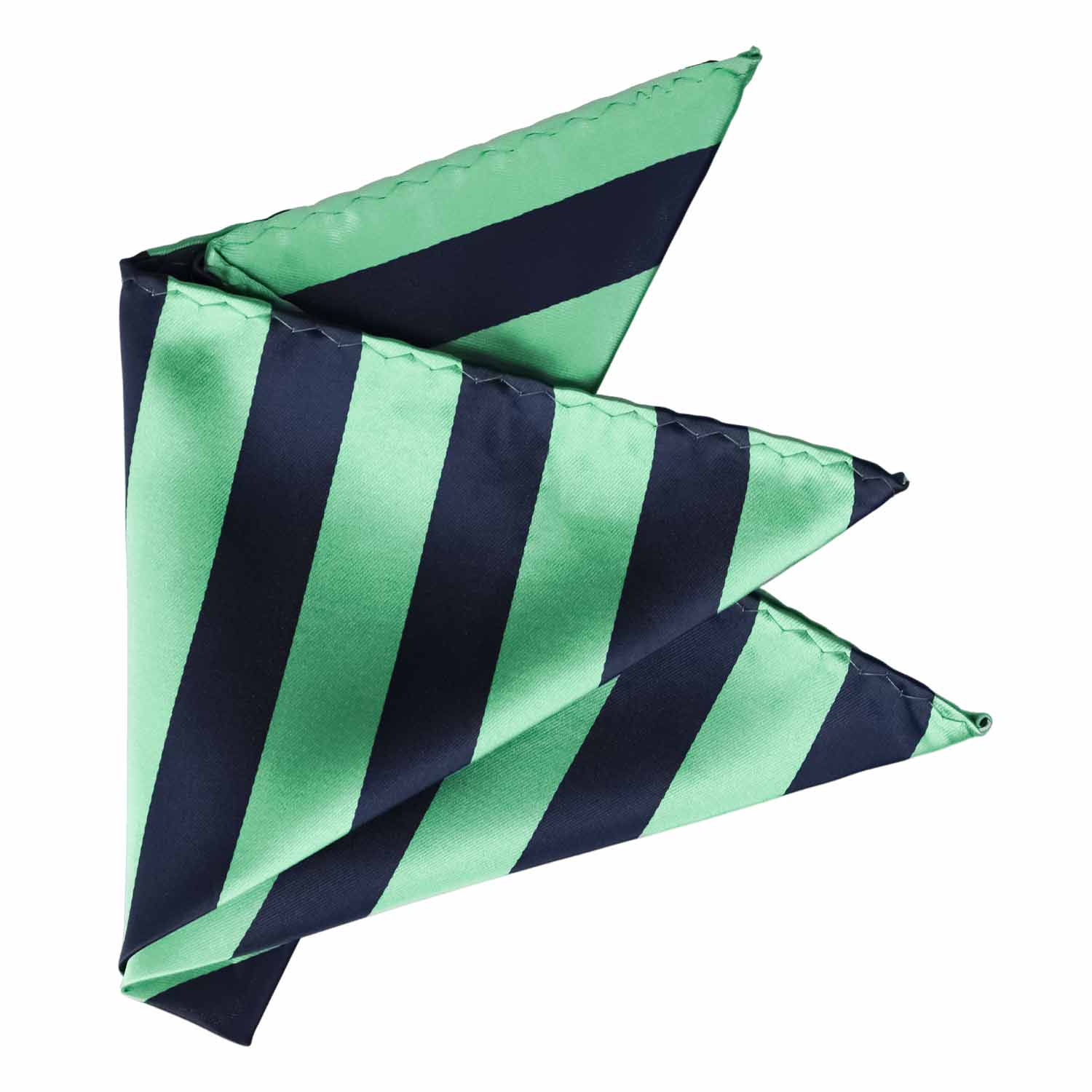 This bright mint and navy blue striped pocket square measures a large, 12-inches by 12-inches to suit a wide variety of folds. The tightly woven material creates a smooth finish for a sharp look. Matches our bright mint and navy blue striped ties and bow ties.