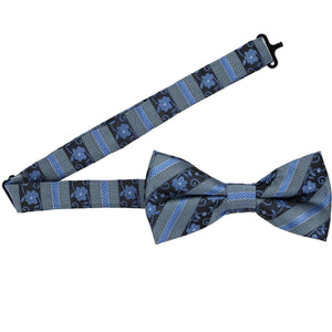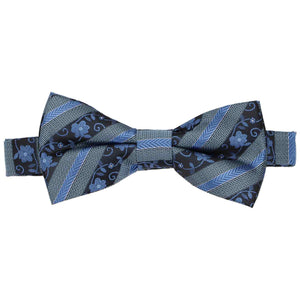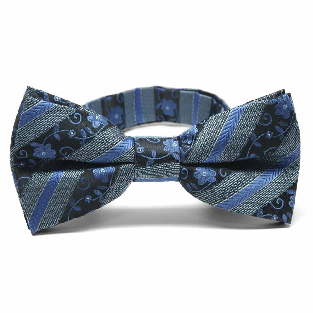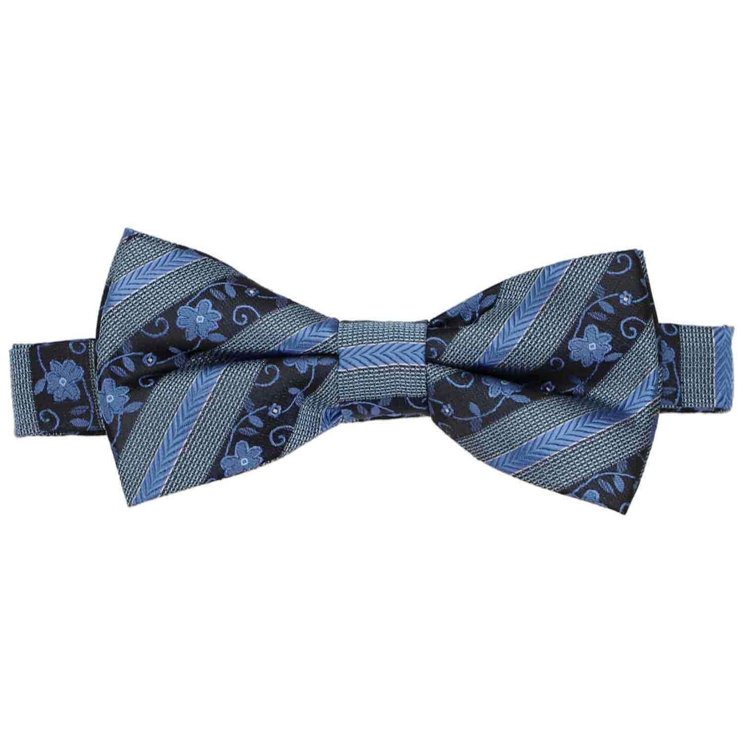 A timeless classic and exclusively ours! This brilliant blue floral striped bow tie combines elegance and ease with its pre-tied design. The alternating floral vine and textured stripe pattern exudes sophistication, perfect for any refined wardrobe. An adjustable band collar ensures a comfortable fit for most adult neck sizes. For a traditional touch, this pattern is also available in a self-tie bow tie and matching pocket square.