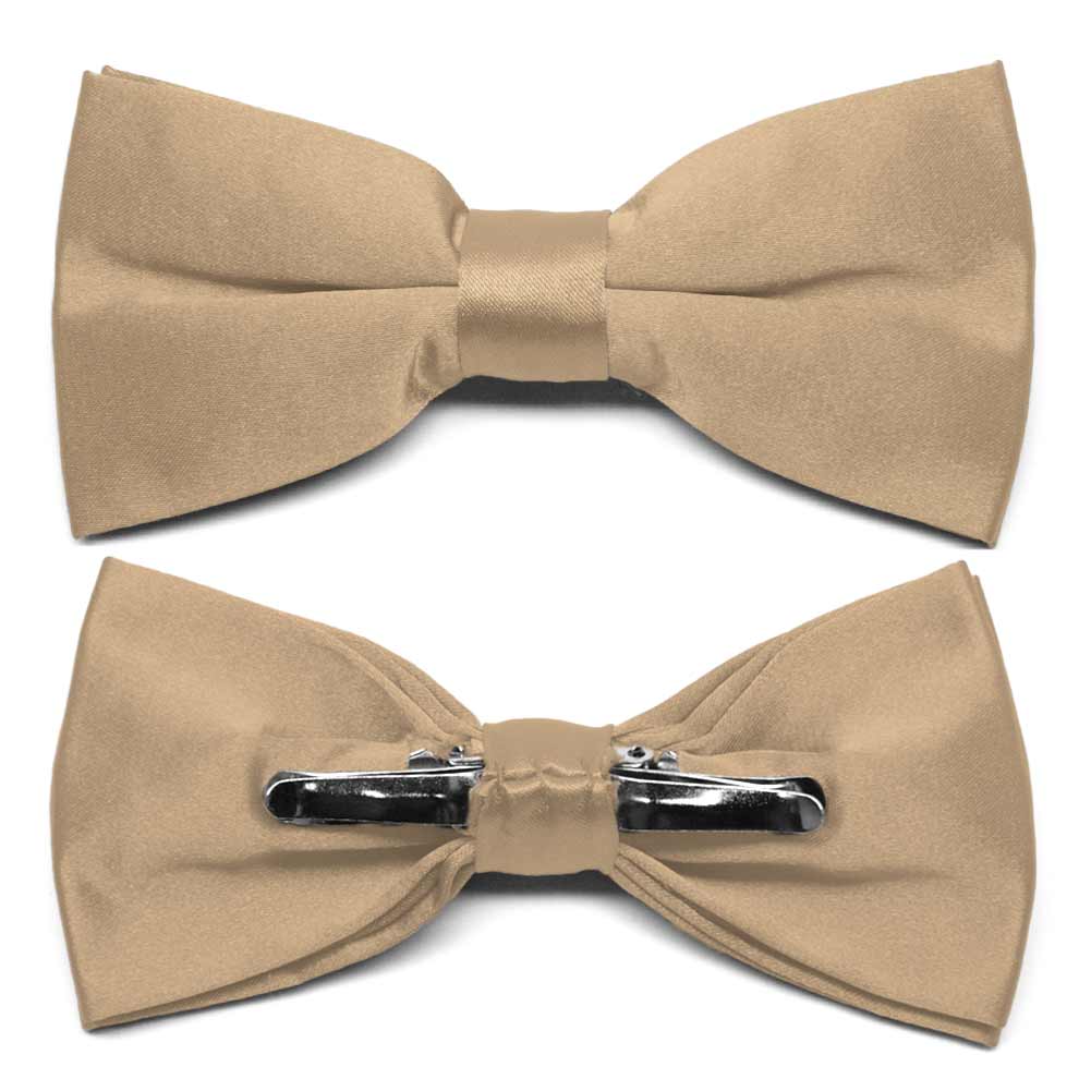 Wear a perfect bow every time with this bronze clip-on bow tie. This pre-tied bow features a heavyweight clip that discretely attaches to either side of your shirt collar material for a secure fit. One size fits all, regardless of neck size. Has a shiny, satin look. Matching pocket squares available.